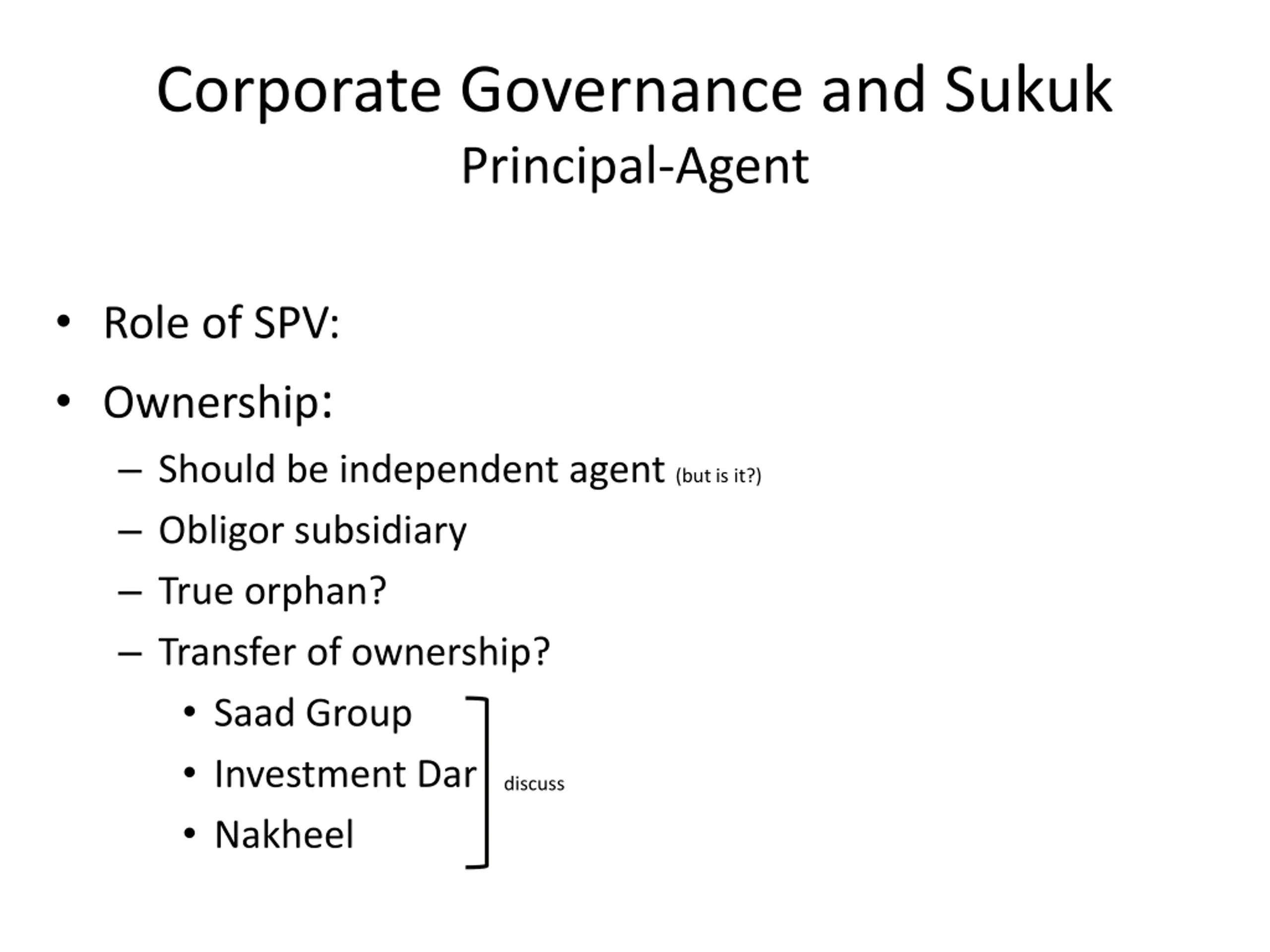 Corporate Governance and Sukuk Principal-Agent Role of SPV: Ownership: Should be independent agent (but is it?) Obligor subsidiary True orphan? Transfer of ownership? Saad Group Investment Dar Nakheel discuss