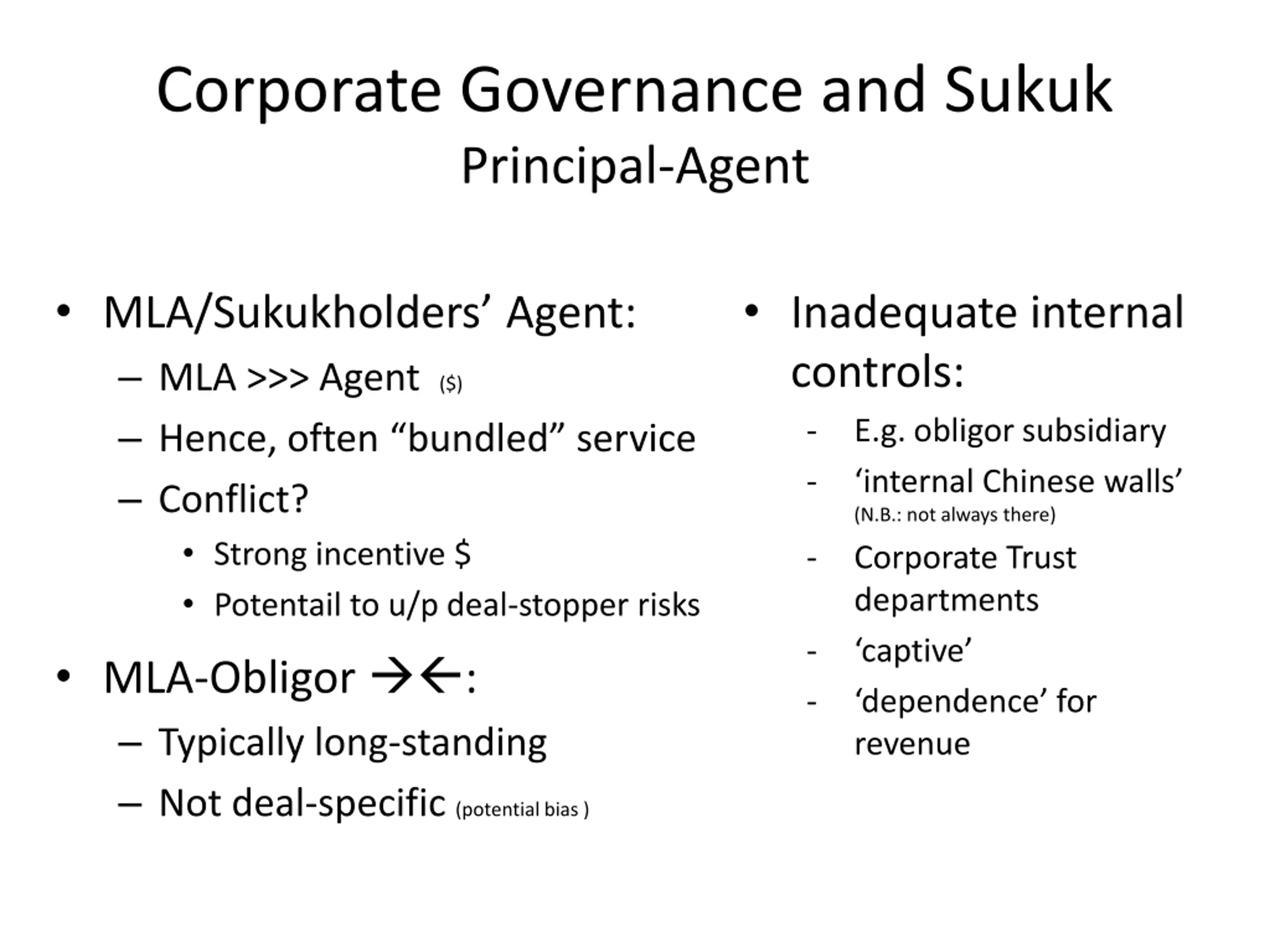 Corporate Governance and Sukuk Principal-Agent MLA/Sukukholders Agent: MLA >>> Agent ($) Hence, often bundled service Conflict? Strong incentive $ Potentail to u/p deal-stopper risks MLA-Obligor : Typically long-standing Not deal-specific (potential bias ) Inadequate internal controls: - E.g. obligor subsidiary - internal Chinese walls (N.B.: not always there) - Corporate Trust departments - captive - dependence for revenue