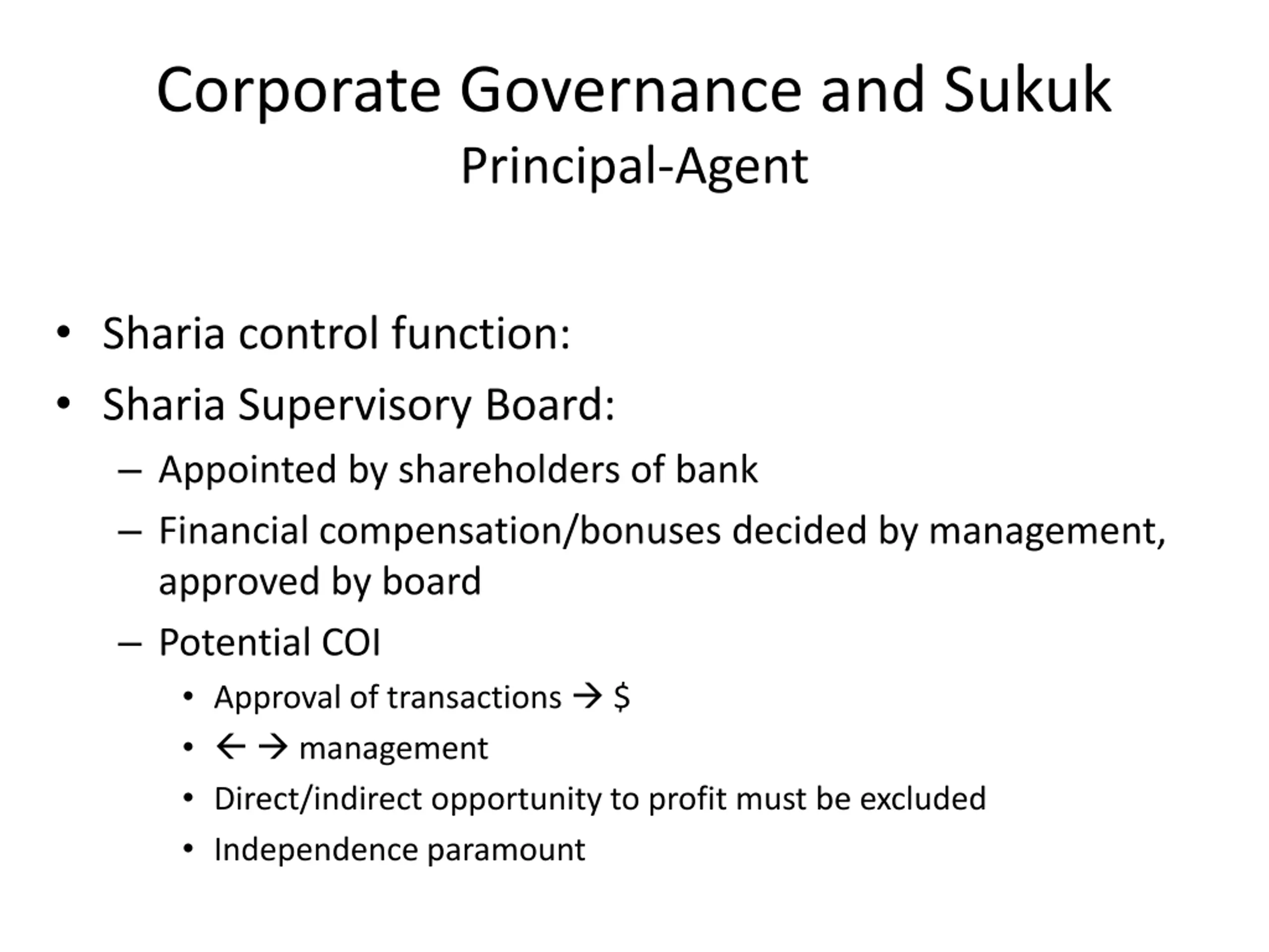 Corporate Governance and Sukuk Principal-Agent Sharia control function: Sharia Supervisory Board: Appointed by shareholders of bank Financial compensation/bonuses decided by management, approved by board Potential COI Approval of transactions $ management Direct/indirect opportunity to profit must be excluded Independence paramount