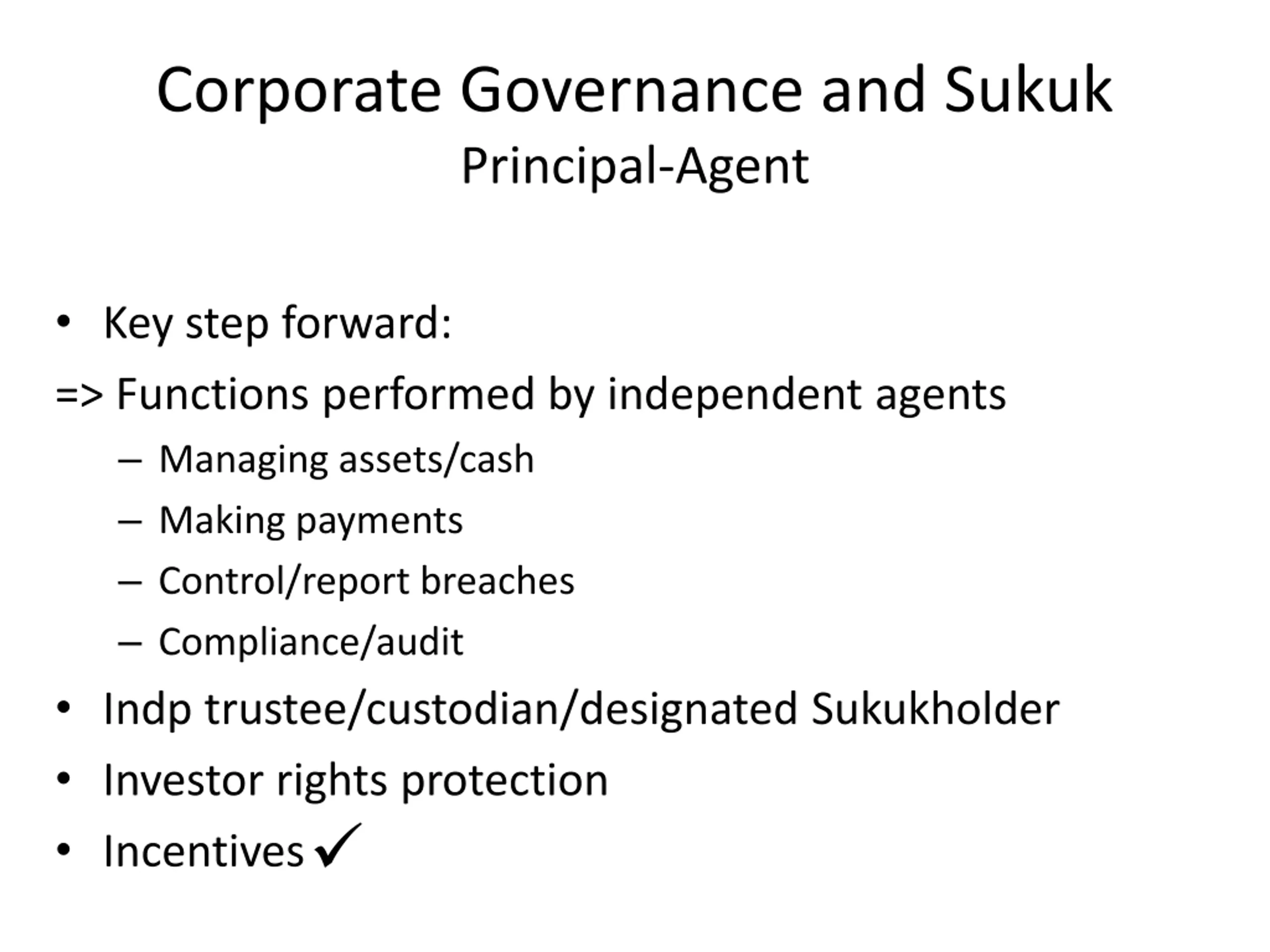 Corporate Governance and Sukuk Principal-Agent Key step forward: => Functions performed by independent agents Managing assets/cash Making payments Control/report breaches Compliance/audit Indp trustee/custodian/designated Sukukholder Investor rights protection Incentives