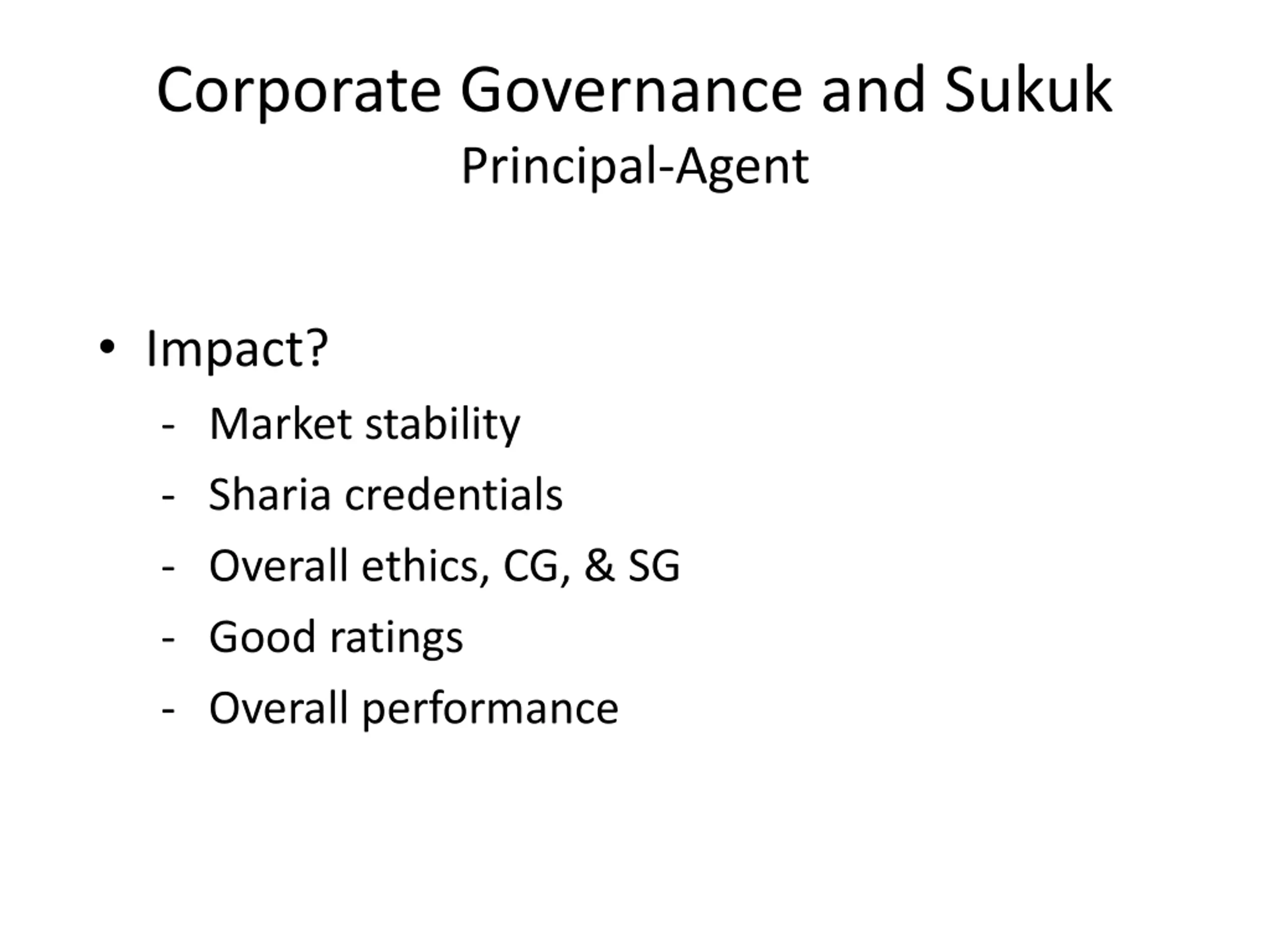 Corporate Governance and Sukuk Principal-Agent Impact? - Market stability - Sharia credentials - Overall ethics, CG, & SG - Good ratings - Overall performance