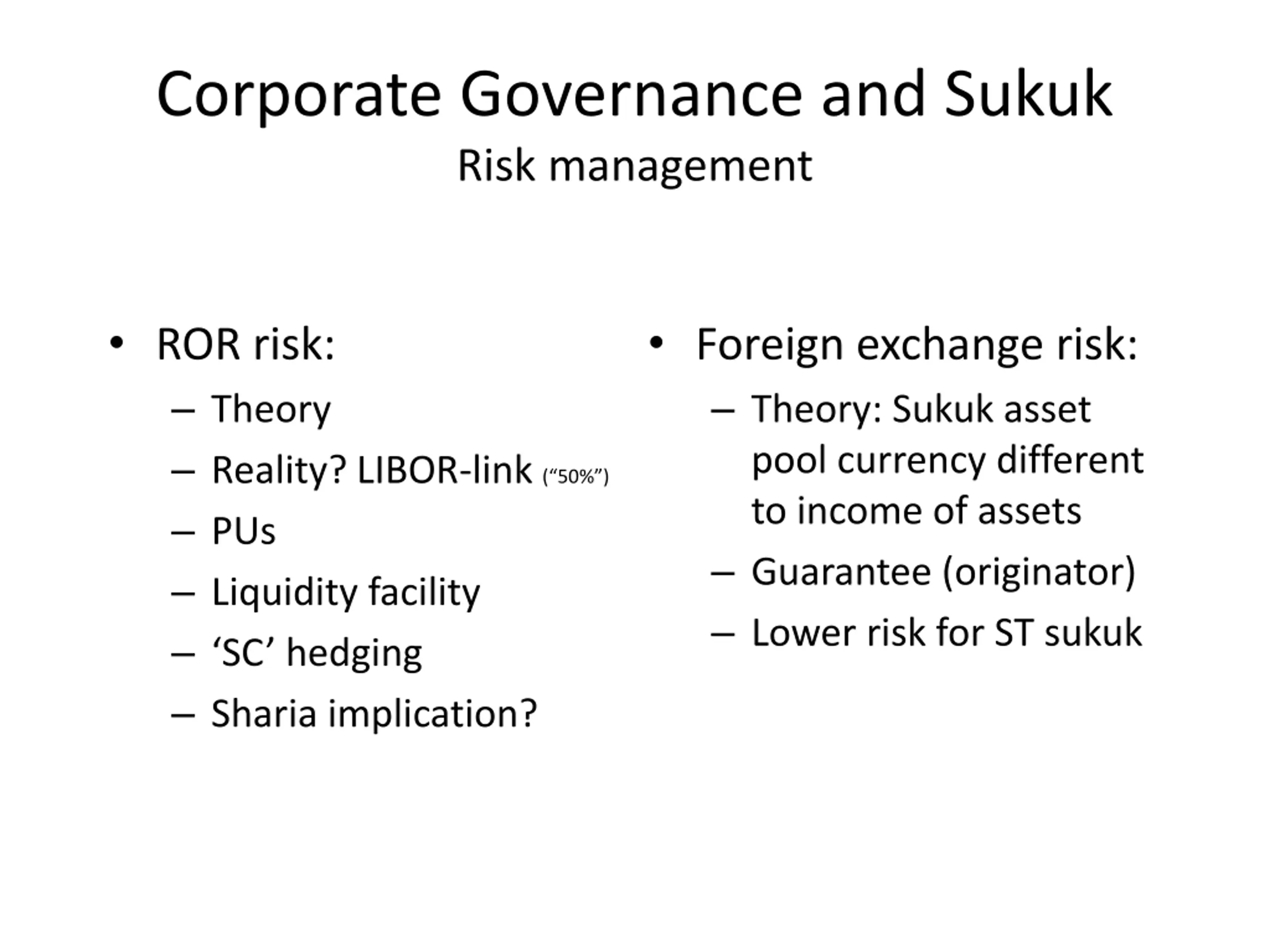 Corporate Governance and Sukuk Risk management ROR risk: Theory Reality? LIBOR-link ( 50% ) PUs Liquidity facility SC hedging Sharia implication? Foreign exchange risk: Theory: Sukuk asset pool currency different to income of assets Guarantee (originator) Lower risk for ST sukuk