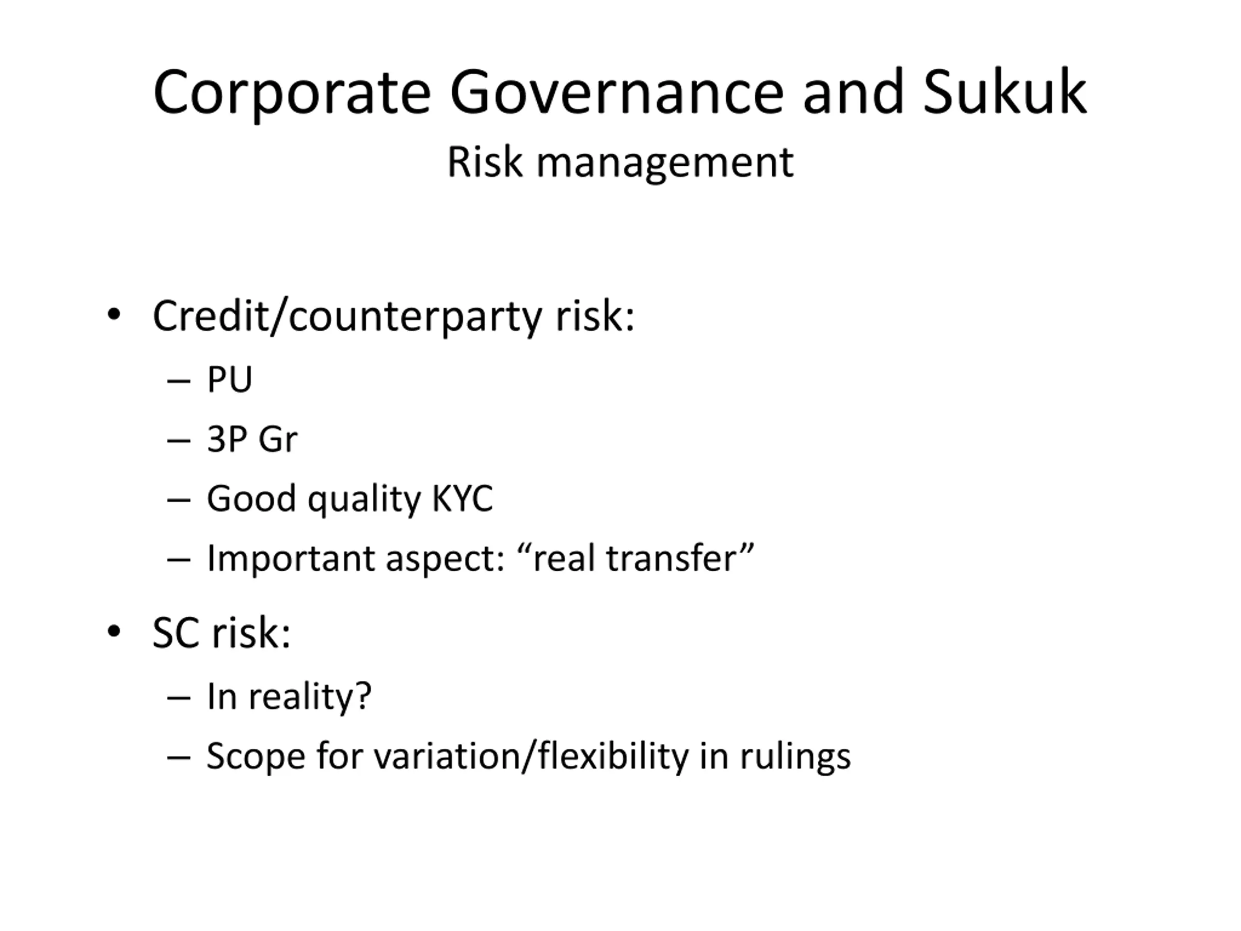 Corporate Governance and Sukuk Risk management Credit/counterparty risk: PU 3P Gr Good quality KYC Important aspect: real transfer SC risk: In reality? Scope for variation/flexibility in rulings