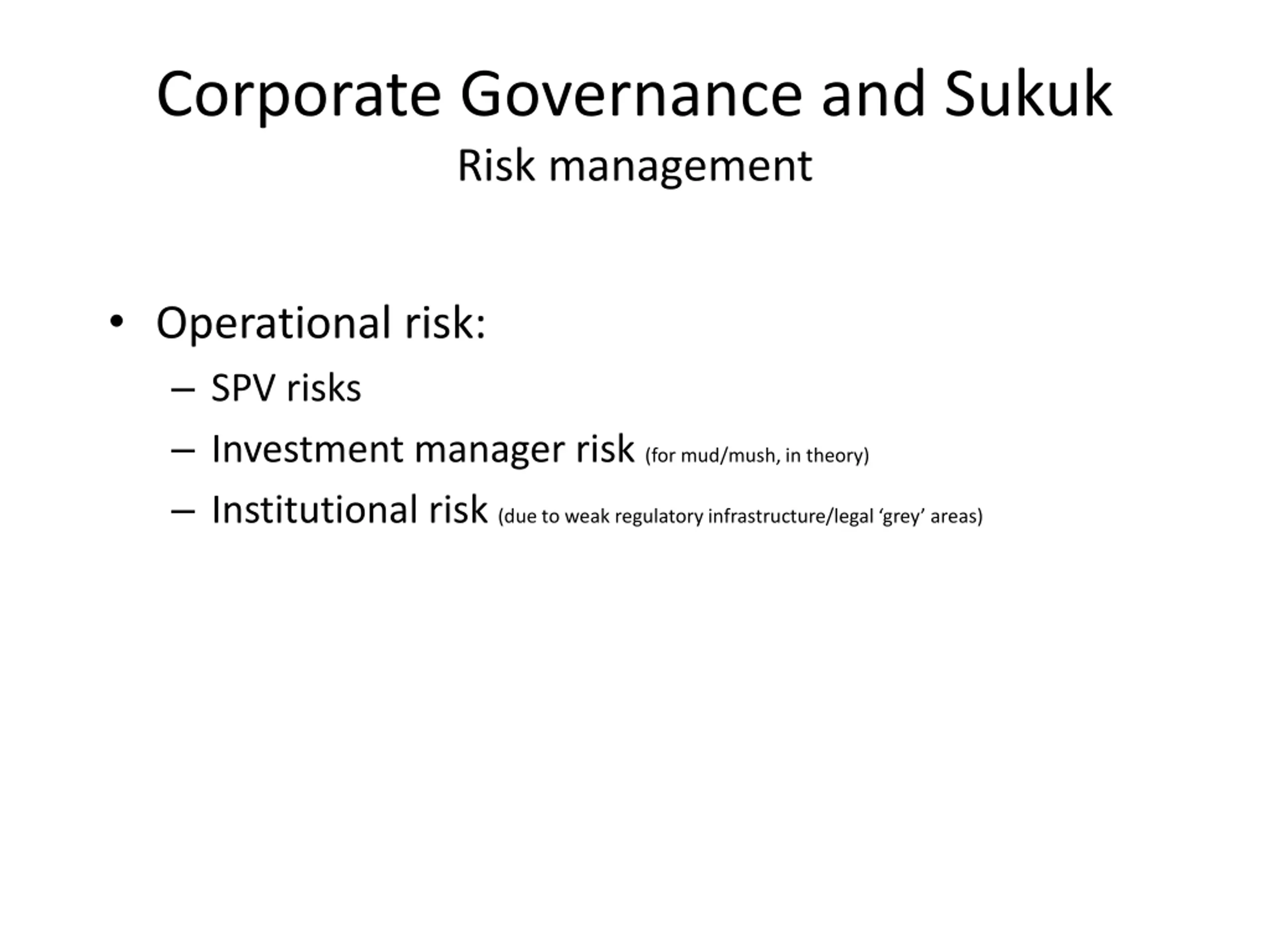 Corporate Governance and Sukuk Risk management Operational risk: SPV risks Investment manager risk (for mud/mush, in theory) Institutional risk (due to weak regulatory infrastructure/legal grey areas)