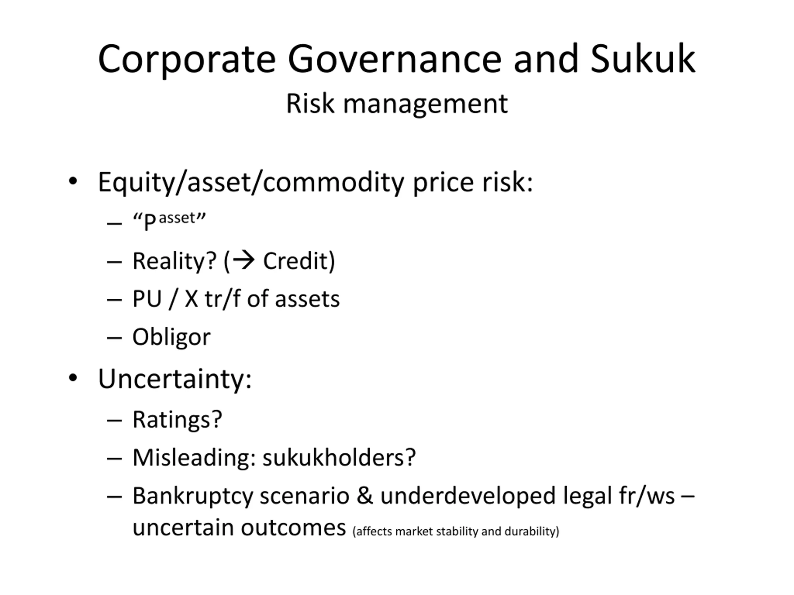 Corporate Governance and Sukuk Risk management Equity/asset/commodity price risk: Passet Reality? ( Credit) PU / X tr/f of assets Obligor Uncertainty: Ratings? Misleading: sukukholders? Bankruptcy scenario & underdeveloped legal fr/ws uncertain outcomes (affects market stability and durability)