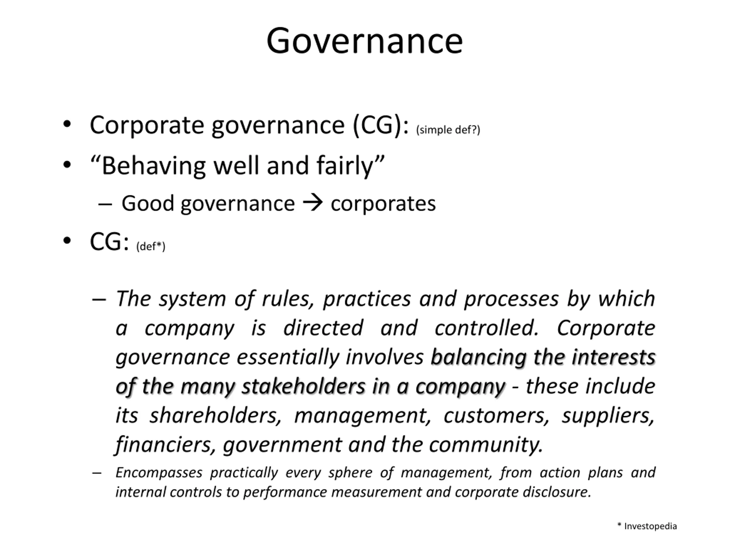 Governance Corporate governance (CG): (simple def?) Behaving well and fairly Good governance corporates CG: (def*) The system of rules, practices and processes by which a company is directed and controlled. Corporate governance essentially involves balancing the interests of the many stakeholders in a company - these include its shareholders, management, customers, suppliers, financiers, government and the community. Encompasses practically every sphere of management, from action plans and internal controls to performance measurement and corporate disclosure. * Investopedia