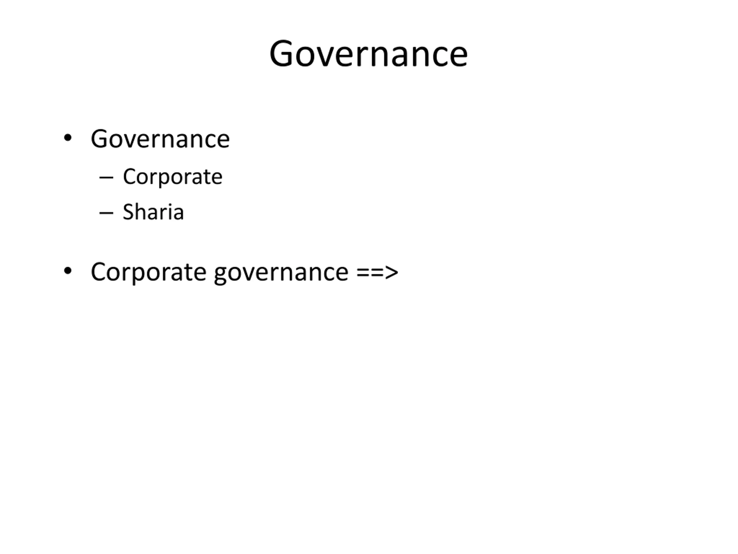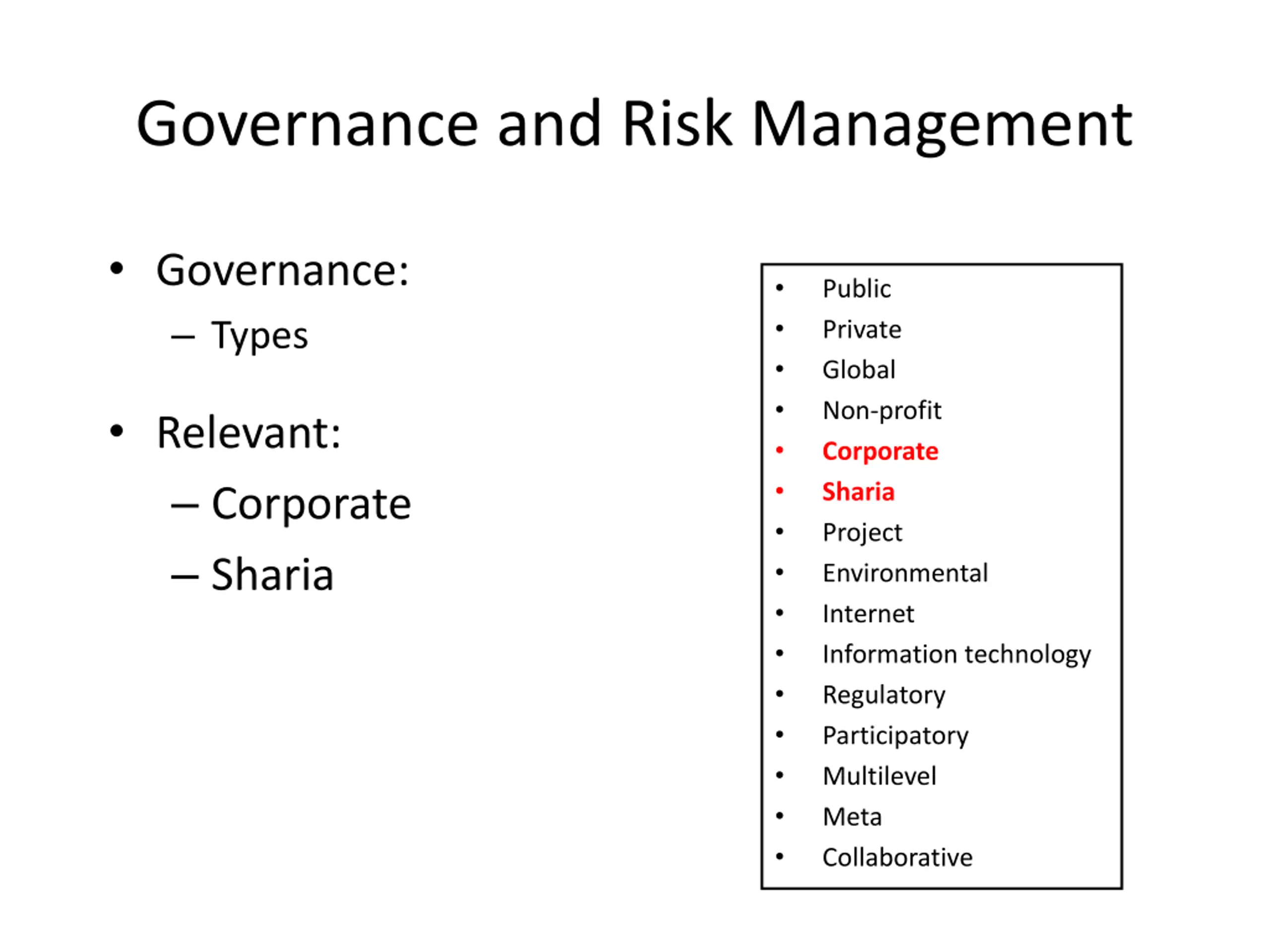 Governance and Risk Management Governance: Types Public Private Global Non-profit Corporate Sharia Project Environmental Internet Information technology Regulatory Participatory Multilevel Meta Collaborative Relevant: Corporate Sharia