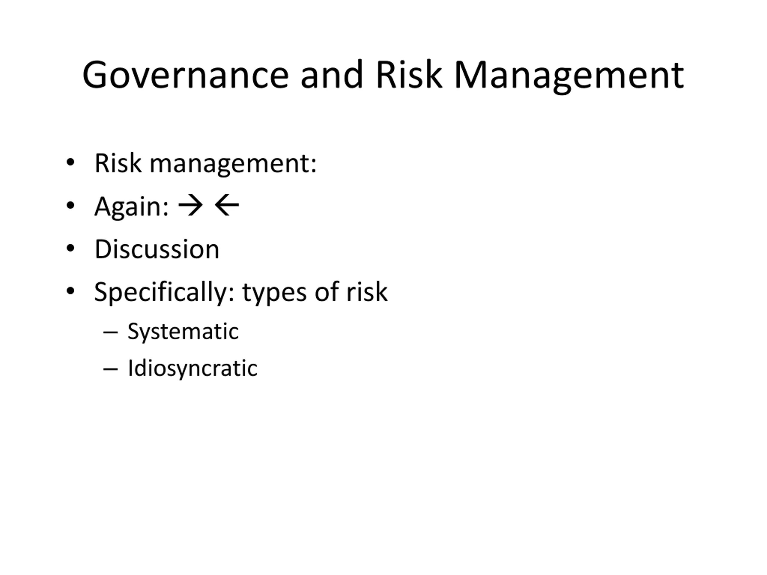 Governance and Risk Management Risk management: Again: Discussion Specifically: types of risk Systematic Idiosyncratic