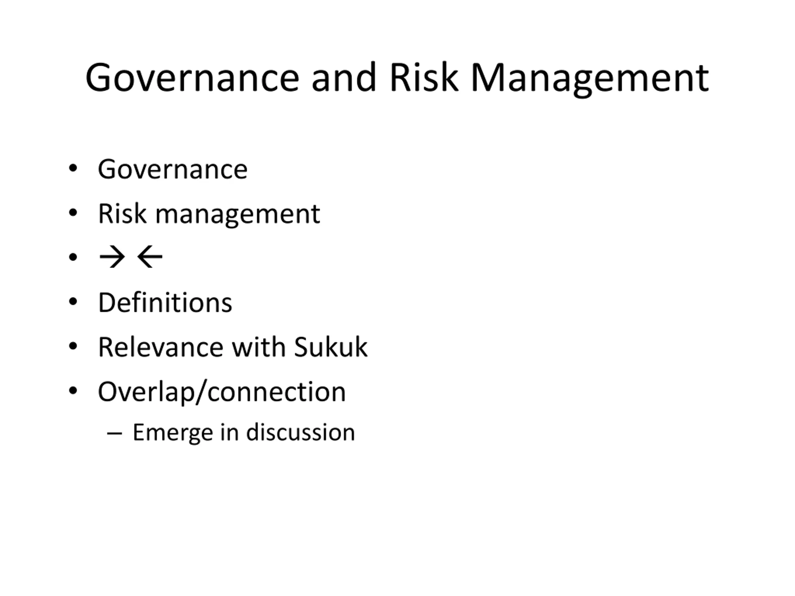 Governance and Risk Management Governance Risk management Definitions Relevance with Sukuk Overlap/connection Emerge in discussion