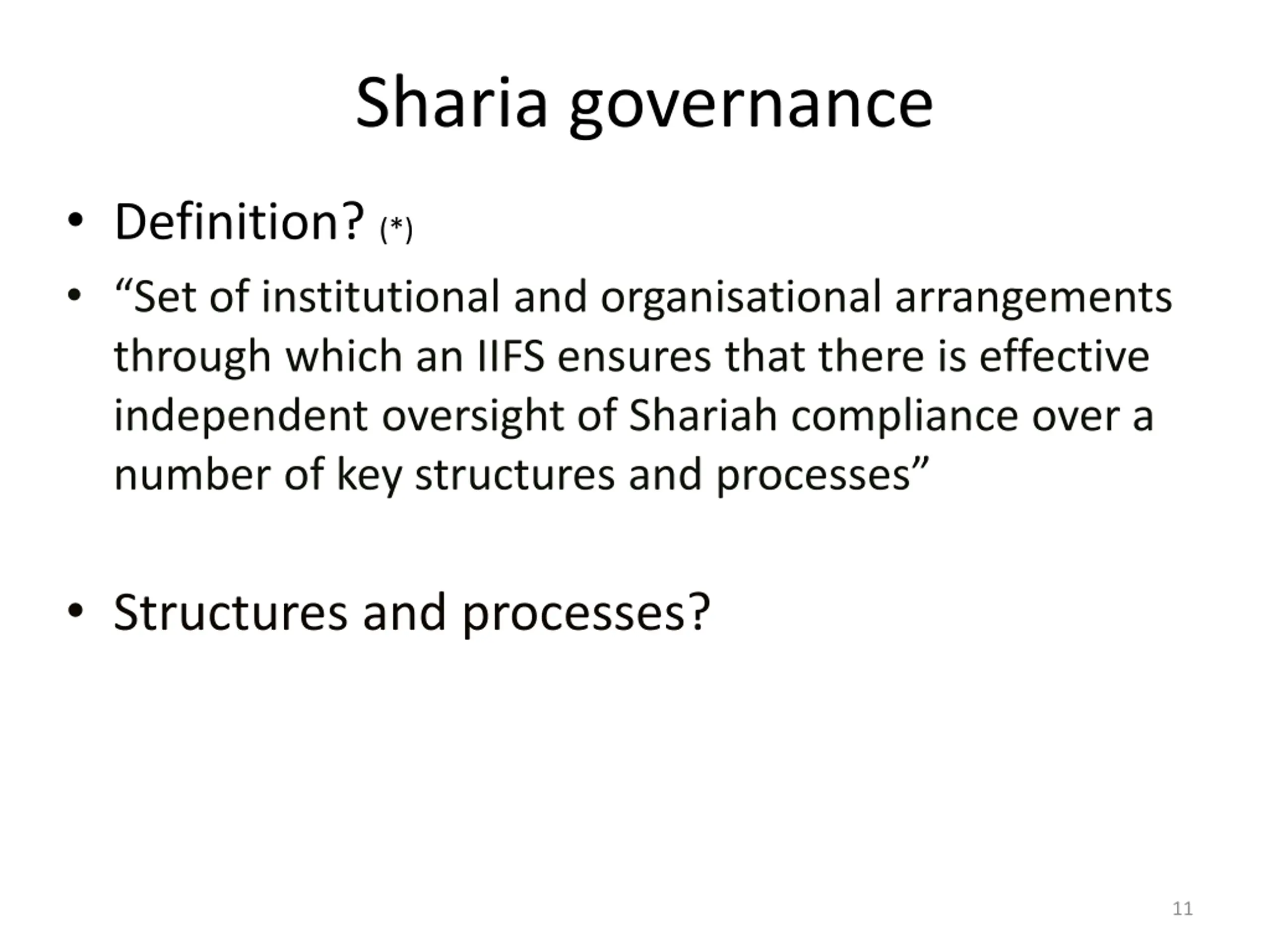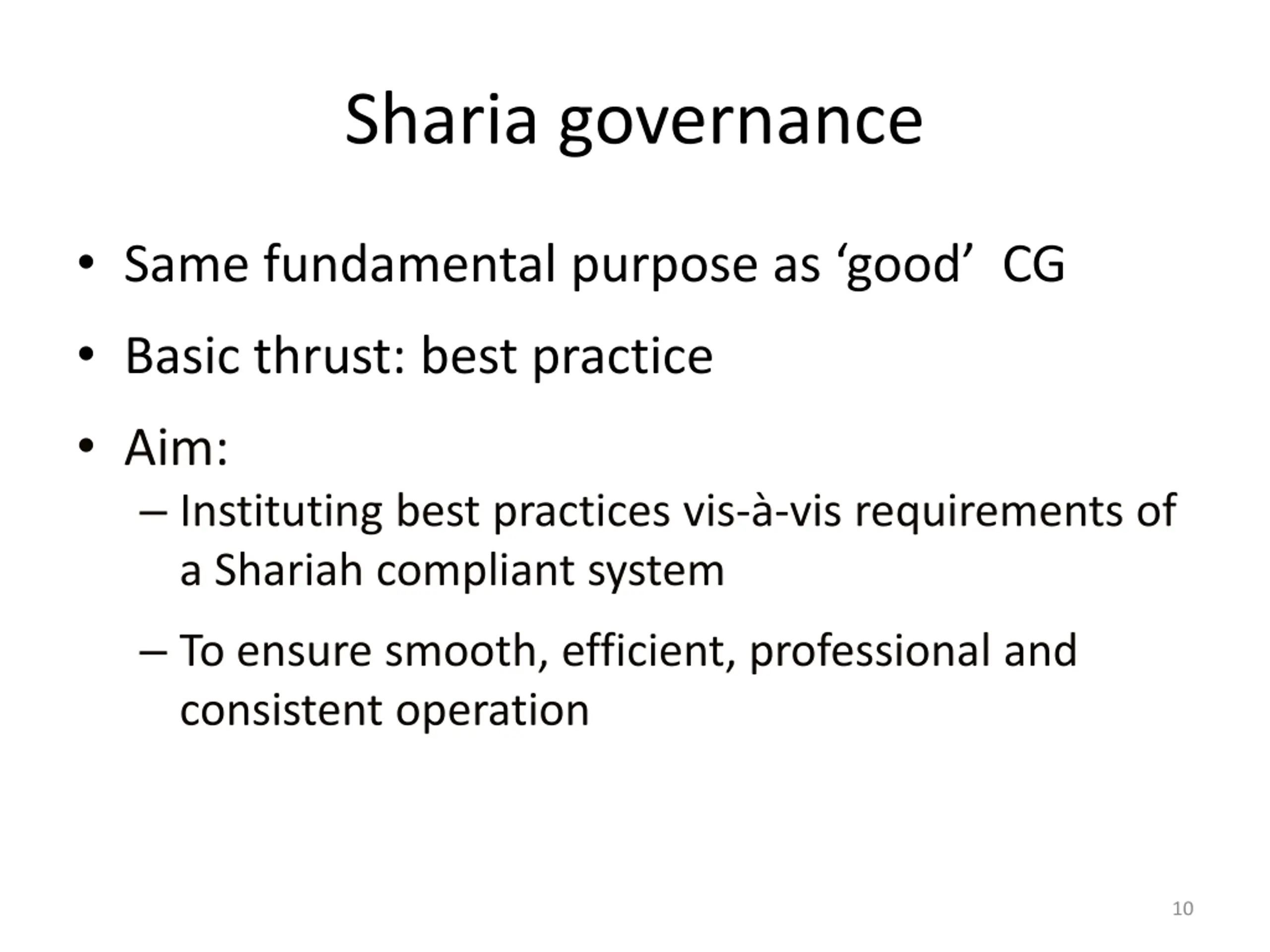 Sharia governance Same fundamental purpose as good CG Basic thrust: best practice Aim: Instituting best practices vis- -vis requirements of a Shariah compliant system To ensure smooth, efficient, professional and consistent operation 10