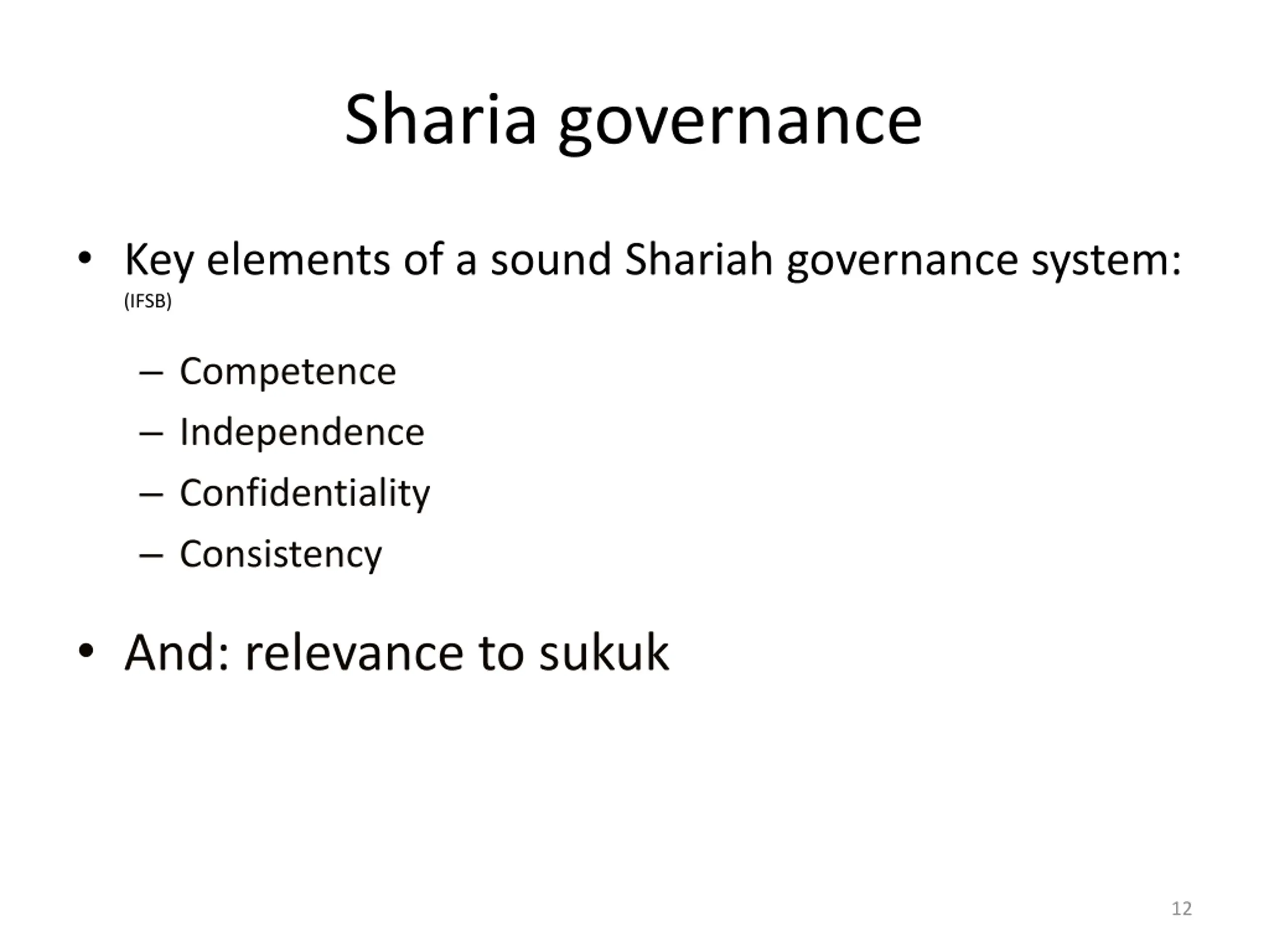 Sharia governance Key elements of a sound Shariah governance system: (IFSB) Competence Independence Confidentiality Consistency And: relevance to sukuk 12