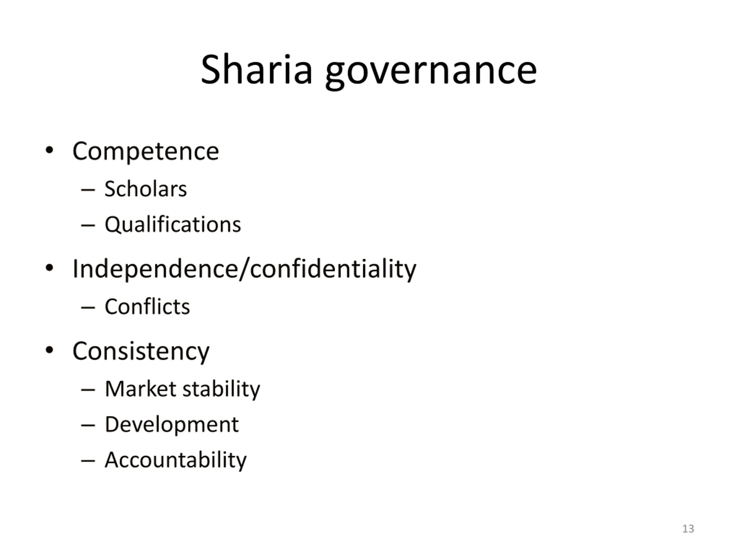 Sharia governance Competence Scholars Qualifications Independence/confidentiality Conflicts Consistency Market stability Development Accountability 13