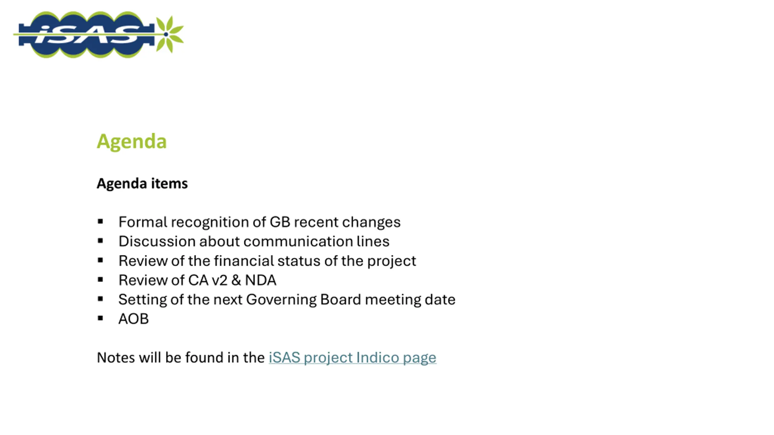 Agenda Agenda items Formal recognition of GB recent changes Discussion about communication lines Review of the financial status of the project Review of CA v2 & NDA Setting of the next Governing Board meeting date AOB Notes will be found in the iSAS project Indico page