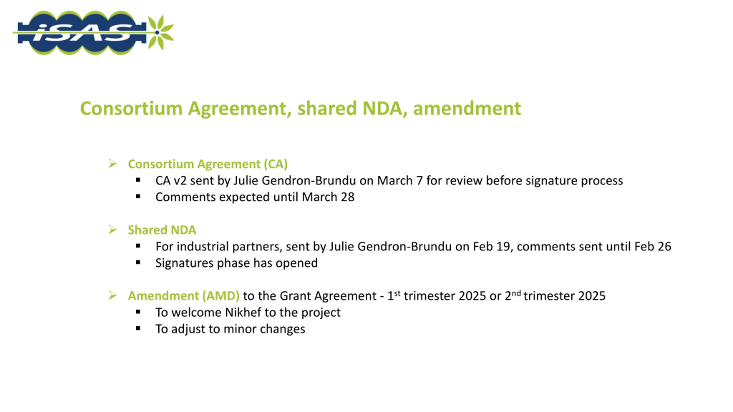 Consortium Agreement, shared NDA, amendment Consortium Agreement (CA) CA v2 sent by Julie Gendron-Brundu on March 7 for review before signature process Comments expected until March 28 Shared NDA For industrial partners, sent by Julie Gendron-Brundu on Feb 19, comments sent until Feb 26 Signatures phase has opened Amendment (AMD) to the Grant Agreement - 1st trimester 2025 or 2nd trimester 2025 To welcome Nikhef to the project To adjust to minor changes