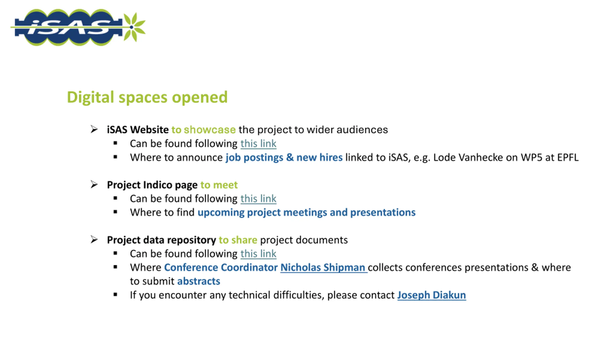 Digital spaces opened iSAS Website to showcase Can be found following this link Where to announce job postings & new hires linked to iSAS, e.g. Lode Vanhecke on WP5 at EPFL showcase the project to wider audiences Project Indico pagetomeet Can be found following this link Where to find upcoming project meetings and presentations Project data repository toshare project documents Can be found following this link Where Conference Coordinator Nicholas Shipman collects conferences presentations & where to submit abstracts If you encounter any technical difficulties, please contact Joseph Diakun