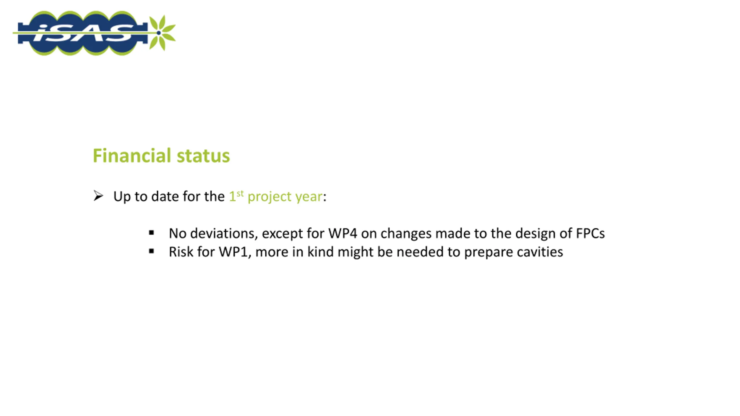 Financial status Up to date for the 1st project year: No deviations, except for WP4 on changes made to the design of FPCs Risk for WP1, more in kind might be needed to prepare cavities