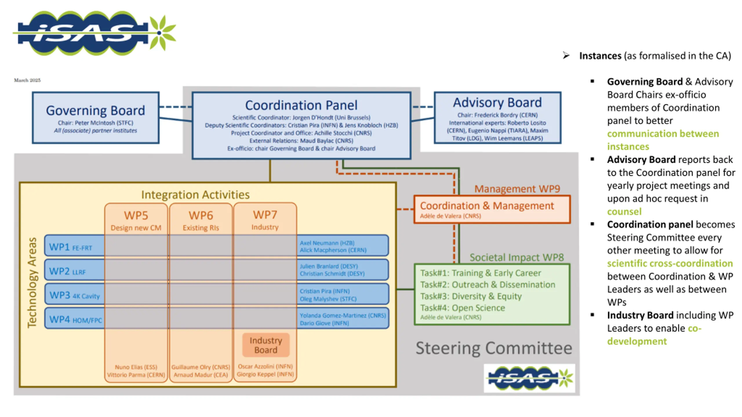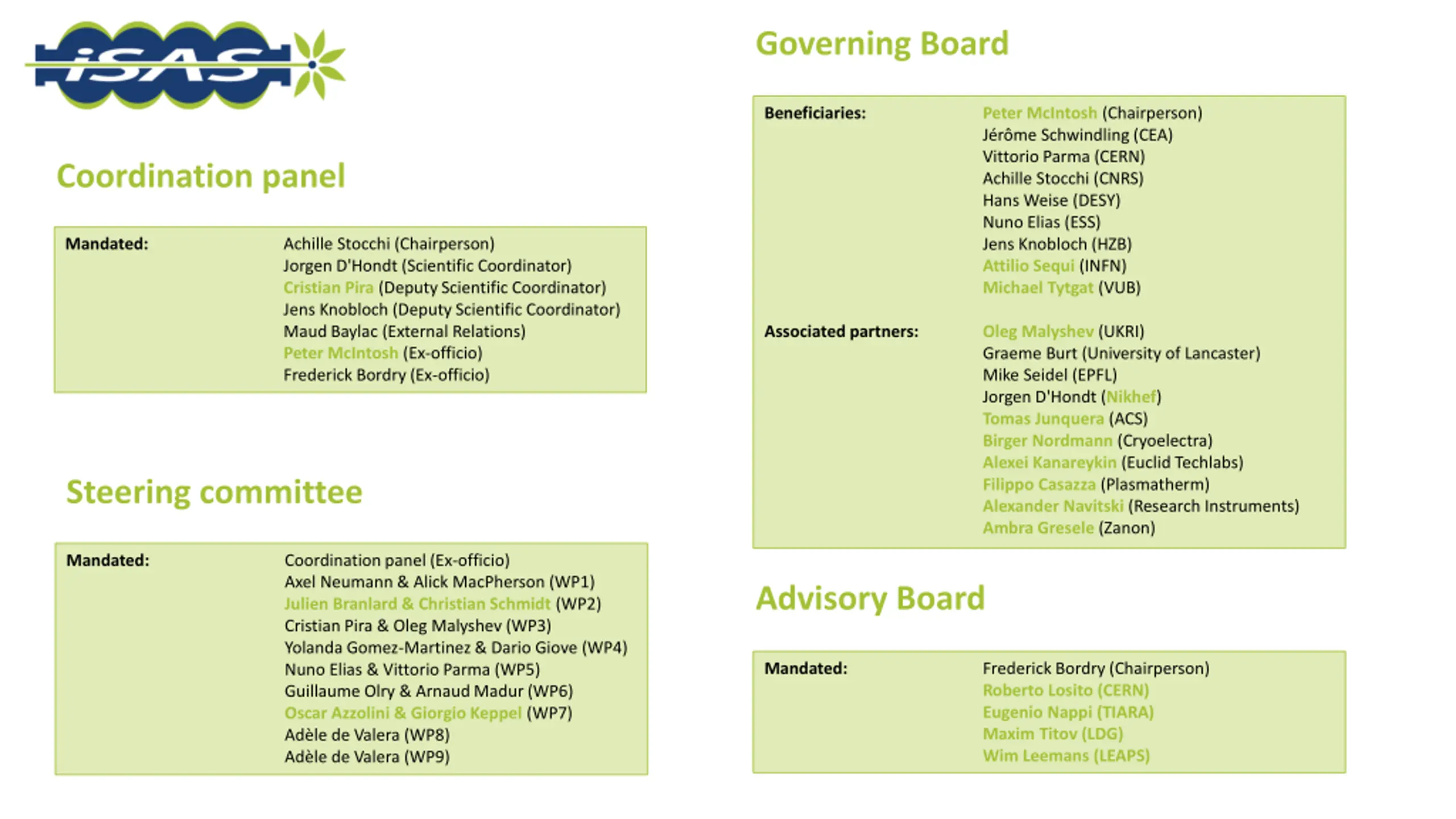 Governing Board Beneficiaries: Peter McIntosh (Chairperson) J r me Schwindling (CEA) Vittorio Parma (CERN) Achille Stocchi (CNRS) Hans Weise (DESY) Nuno Elias (ESS) Jens Knobloch (HZB) Attilio Sequi (INFN) Michael Tytgat (VUB) Coordination panel Mandated: Achille Stocchi (Chairperson) Jorgen D'Hondt (Scientific Coordinator) Cristian Pira (Deputy Scientific Coordinator) Jens Knobloch (Deputy Scientific Coordinator) Maud Baylac (External Relations) Peter McIntosh (Ex-officio) Frederick Bordry (Ex-officio) Associated partners: Oleg Malyshev (UKRI) Graeme Burt (University of Lancaster) Mike Seidel (EPFL) Jorgen D'Hondt (Nikhef) Tomas Junquera (ACS) Birger Nordmann (Cryoelectra) Alexei Kanareykin (Euclid Techlabs) Filippo Casazza (Plasmatherm) Alexander Navitski (Research Instruments) Ambra Gresele (Zanon) Steering committee Mandated: Coordination panel (Ex-officio) Axel Neumann & Alick MacPherson (WP1) Julien Branlard & Christian Schmidt (WP2) Cristian Pira & Oleg Malyshev (WP3) Yolanda Gomez-Martinez & Dario Giove (WP4) Nuno Elias & Vittorio Parma (WP5) Guillaume Olry & Arnaud Madur (WP6) Oscar Azzolini & Giorgio Keppel (WP7) Ad le de Valera (WP8) Ad le de Valera (WP9) Advisory Board Mandated: Frederick Bordry (Chairperson) Roberto Losito (CERN) Eugenio Nappi (TIARA) Maxim Titov (LDG) Wim Leemans (LEAPS)