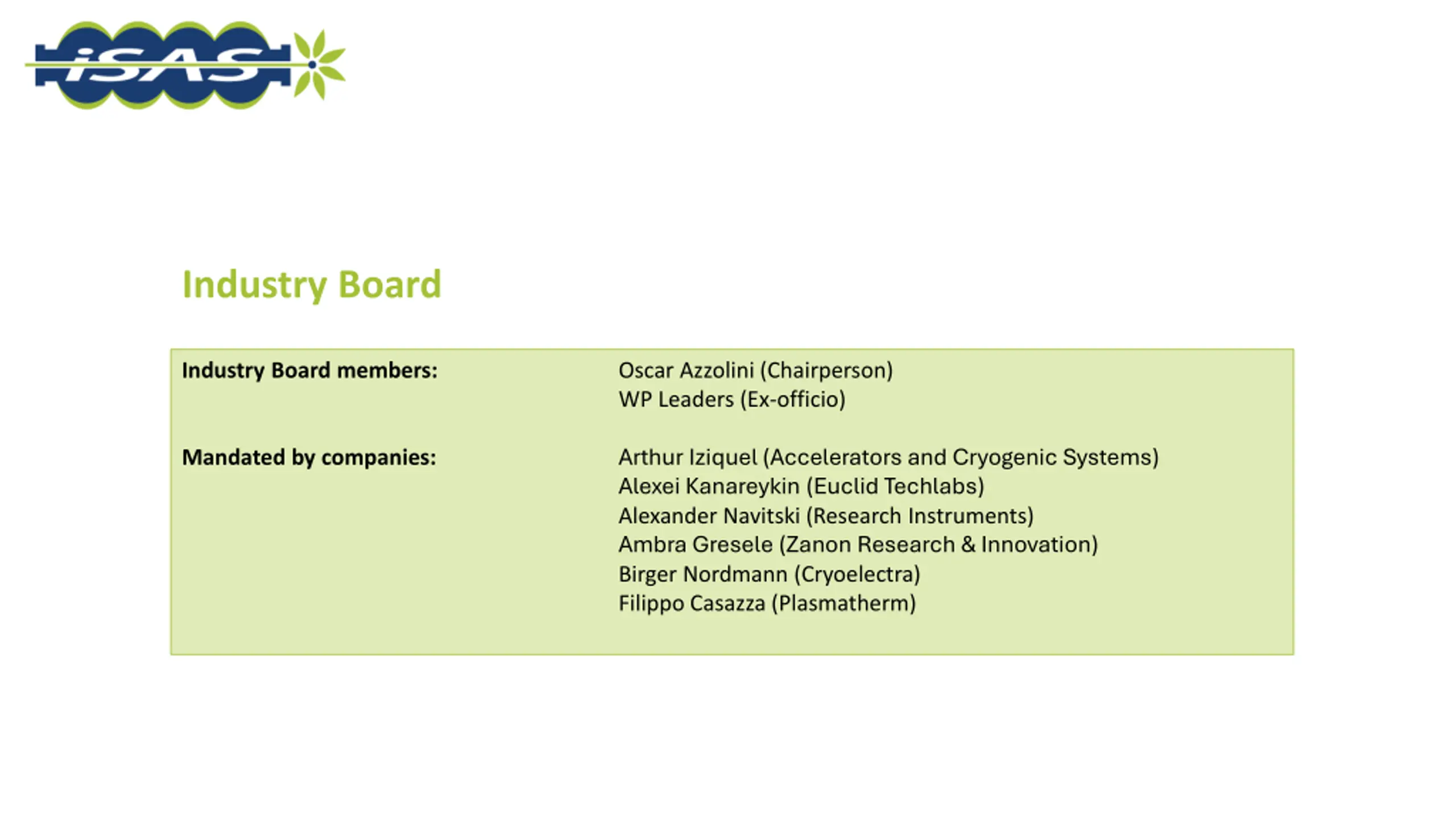 Industry Board Industry Board members: Mandated by companies: Oscar Azzolini (Chairperson) WP Leaders (Ex-officio) Arthur Iziquel (Accelerators and Cryogenic Systems) Alexei Kanareykin (Euclid Techlabs) Alexander Navitski (Research Instruments) Ambra Gresele (Zanon Research & Innovation) Birger Nordmann (Cryoelectra) Filippo Casazza (Plasmatherm)