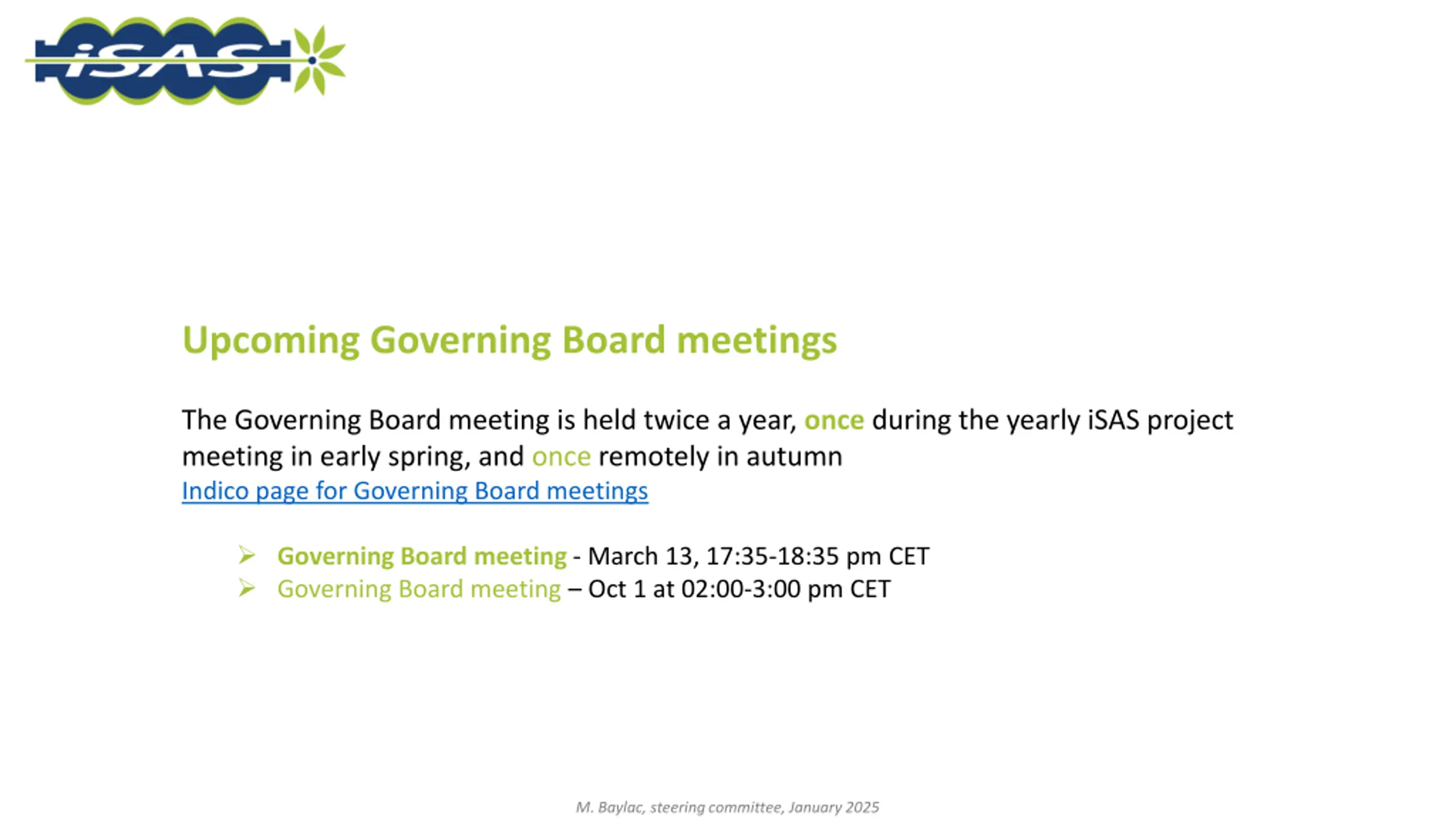 Upcoming Governing Board meetings The Governing Board meeting is held twice a year, once during the yearly iSAS project meeting in early spring, and once remotely in autumn Indico page for Governing Board meetings Governing Board meeting - March 13, 17:35-18:35 pm CET Governing Board meeting Oct 1 at 02:00-3:00 pm CET M. Baylac, steering committee, January 2025