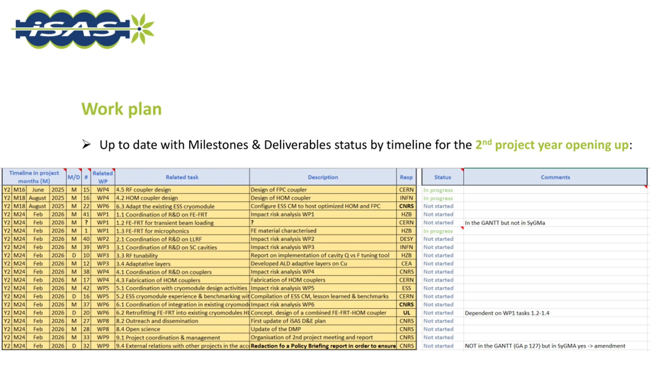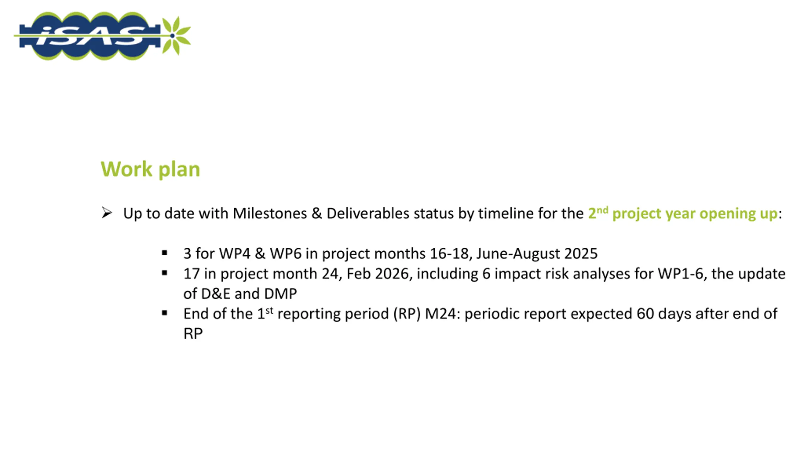Work plan Up to date with Milestones & Deliverables status by timeline for the 2nd project year opening up: 3 for WP4 & WP6 in project months 16-18, June-August 2025 17 in project month 24, Feb 2026, including 6 impact risk analyses for WP1-6, the update of D&E and DMP End of the 1st reporting period (RP) M24: periodic report expected 60 days after end of RP