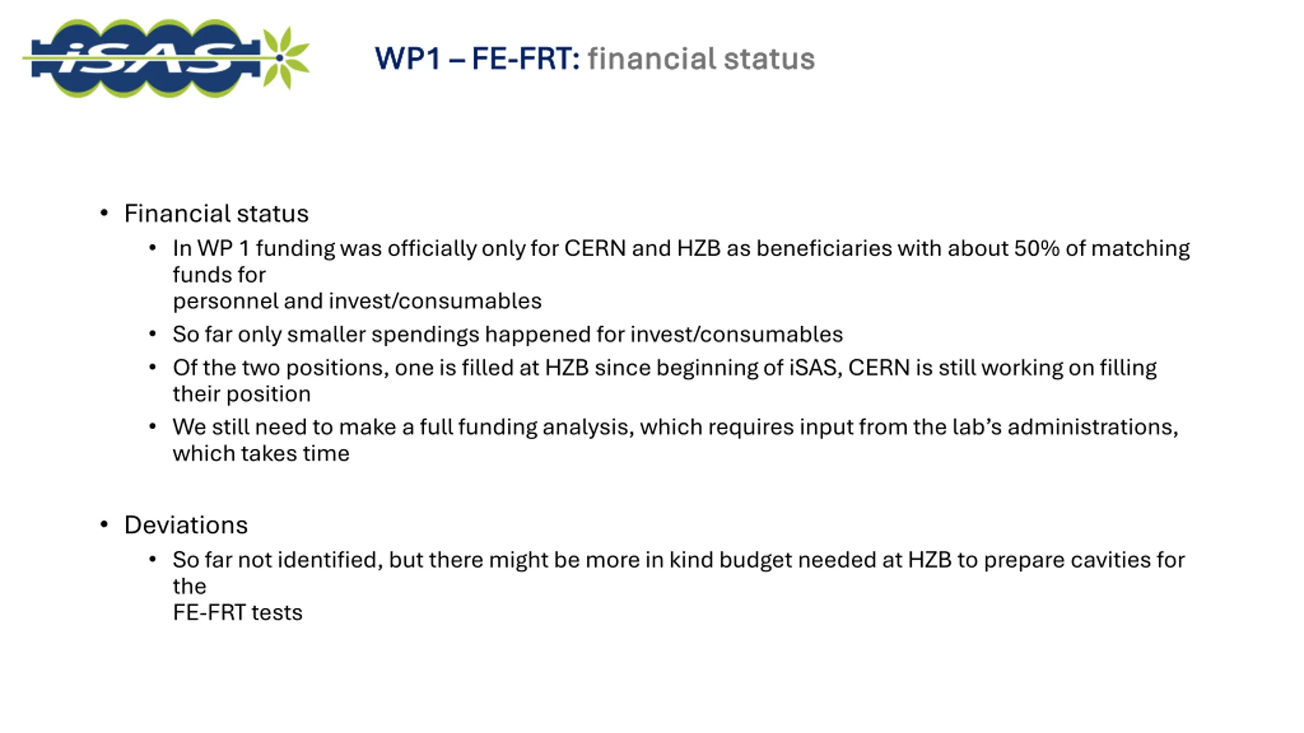 WP1 WP1 FE FE- -FRT: FRT: financial status financial status Financial status In WP 1 funding was officially only for CERN and HZB as beneficiaries with about 50% of matching funds for personnel and invest/consumables So far only smaller spendings happened for invest/consumables Of the two positions, one is filled at HZB since beginning of iSAS, CERN is still working on filling their position We still need to make a full funding analysis, which requires input from the lab s administrations, which takes time Deviations So far not identified, but there might be more in kind budget needed at HZB to prepare cavities for the FE-FRT tests