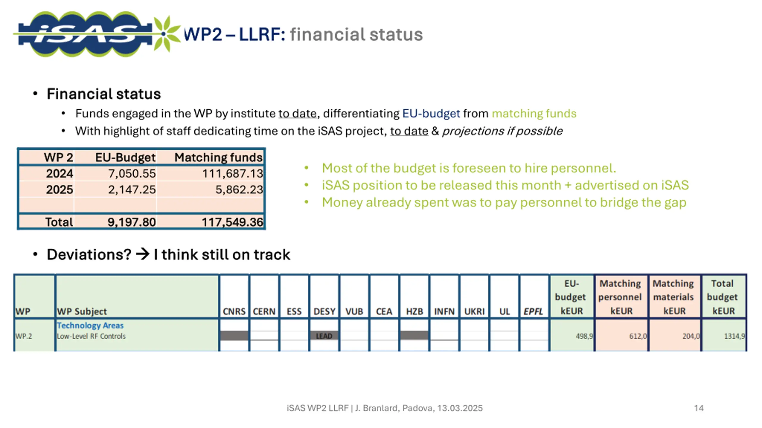 WP2 WP2 LLRF: LLRF: financial status financial status Financial status Financial status Funds engaged in the WP by institute to date, differentiating EU-budget from matching funds With highlight of staff dedicating time on the iSAS project, to date & projections if possible WP 2 WP 2 2024 2024 2025 2025 EU EU- -Budget Budget 7,050.55 2,147.25 Matching funds Matching funds 111,687.13 5,862.23 Most of the budget is foreseen to hire personnel. iSAS position to be released this month + advertised on iSAS Money already spent was to pay personnel to bridge the gap Total Total 9,197.80 9,197.80 117,549.36 117,549.36 Deviations? Deviations? I think still on track I think still on track iSAS WP2 LLRF | J. Branlard, Padova, 13.03.2025 14