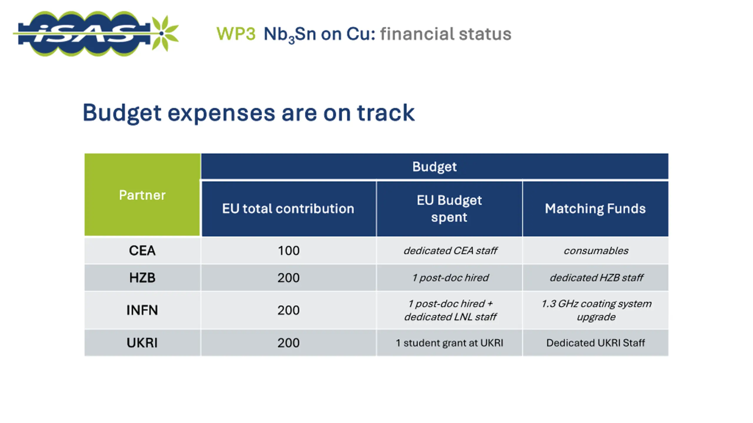 WP3 WP3 Nb Nb3 3Sn on Cu: Sn on Cu: financial status financial status Budget expenses are on track Budget expenses are on track Budget Budget Partner Partner EU Budget EU Budget spent spent EU total contribution EU total contribution Matching Funds Matching Funds CEA CEA 100 dedicated CEA staff consumables HZB HZB 200 1 post-doc hired dedicated HZB staff 1 post-doc hired + dedicated LNL staff 1.3 GHz coating system upgrade INFN INFN 200 UKRI UKRI 200 1 student grant at UKRI Dedicated UKRI Staff