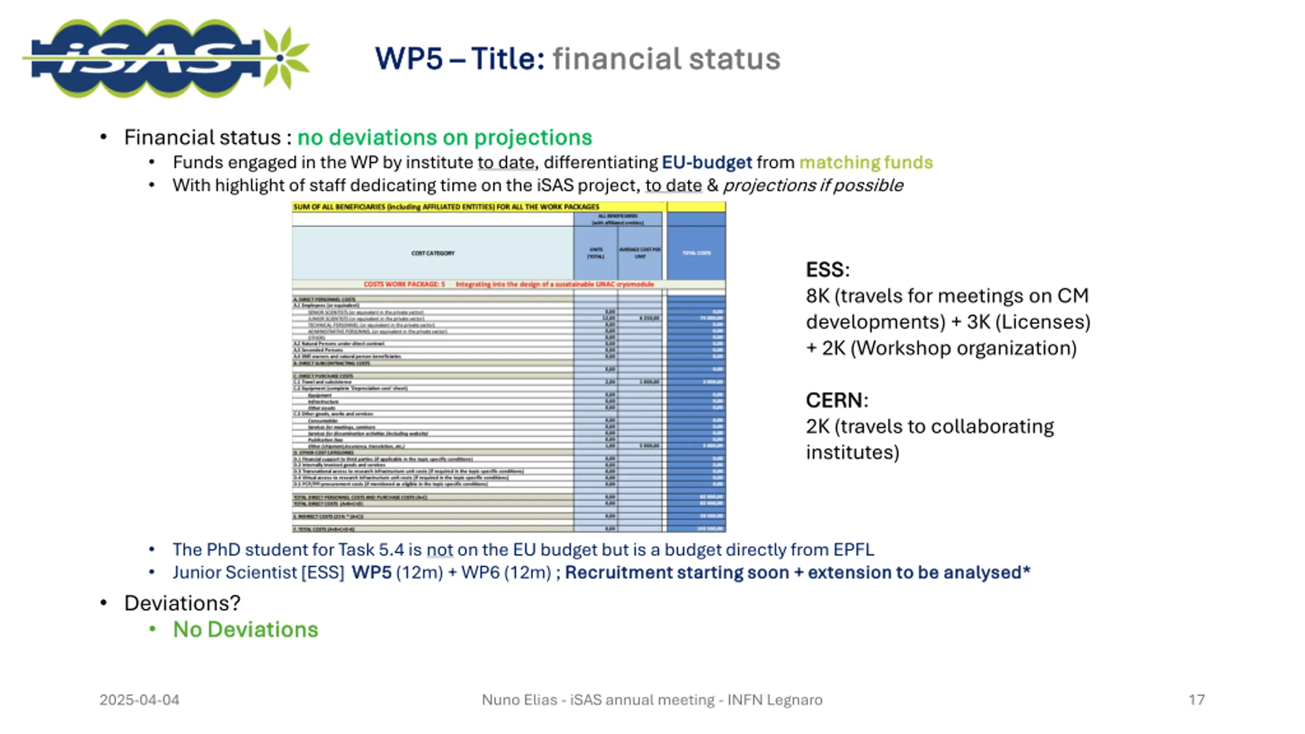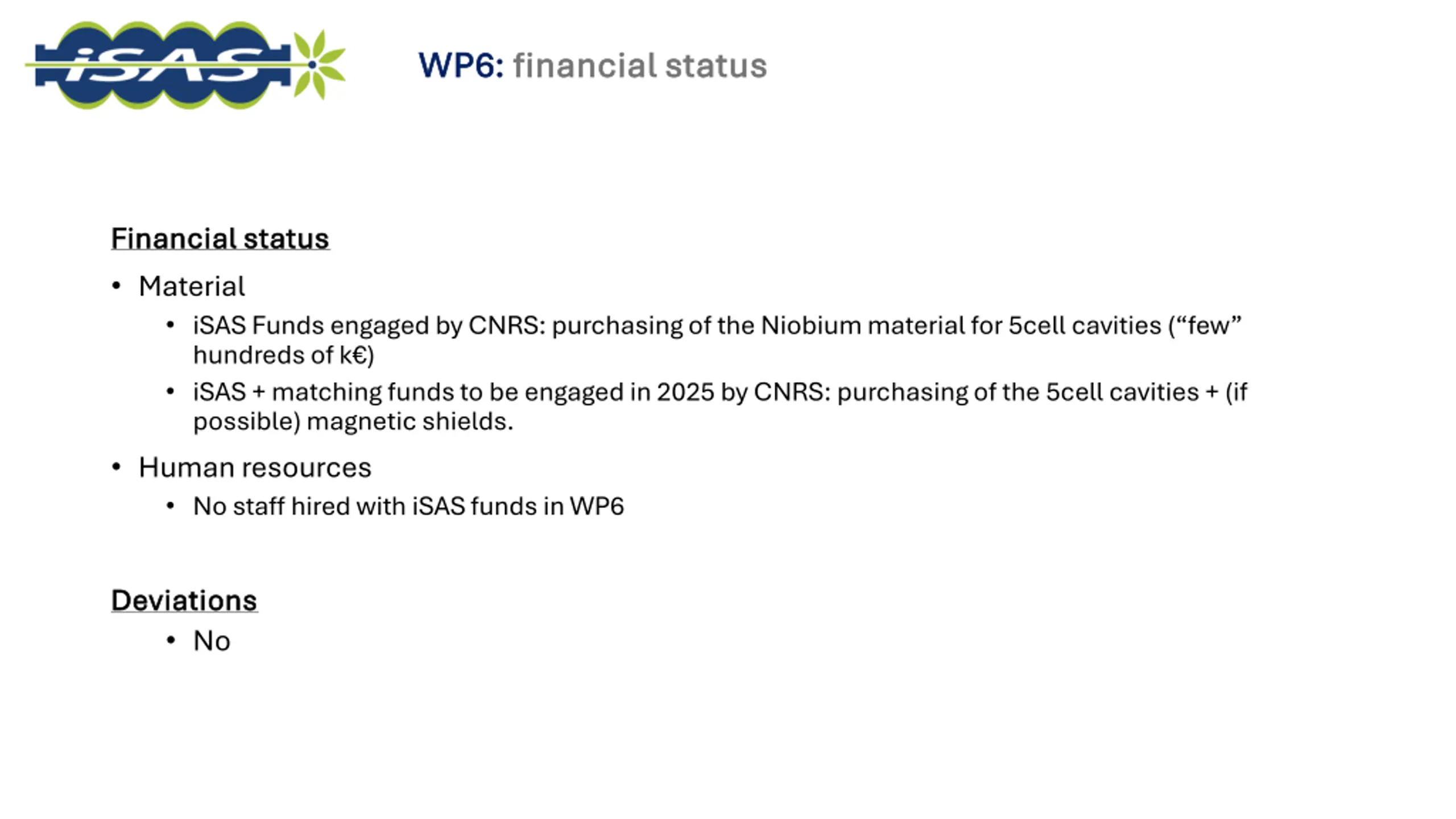 WP6: WP6: financial status financial status Financial status Financial status Material iSAS Funds engaged by CNRS: purchasing of the Niobium material for 5cell cavities ( few hundreds of k ) iSAS + matching funds to be engaged in 2025 by CNRS: purchasing of the 5cell cavities + (if possible) magnetic shields. Human resources No staff hired with iSAS funds in WP6 Deviations Deviations No