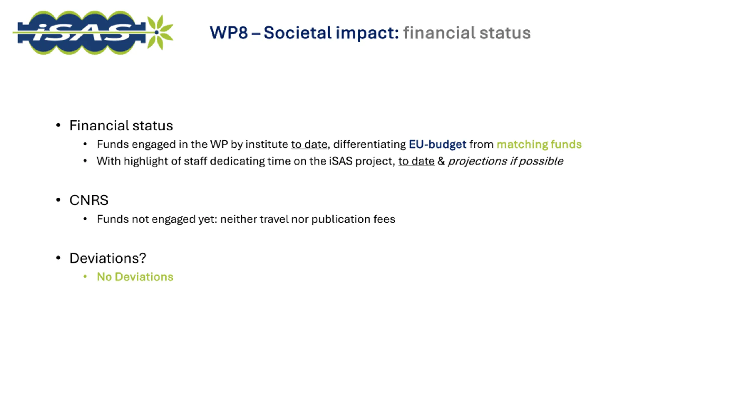 WP8 WP8 Societal impact: Societal impact: financial status financial status Financial status Funds engaged in the WP by institute to date, differentiating EU With highlight of staff dedicating time on the iSAS project, to date & projections if possible EU- -budget budget from matching funds matching funds CNRS Funds not engaged yet: neither travel nor publication fees Deviations? No Deviations No Deviations