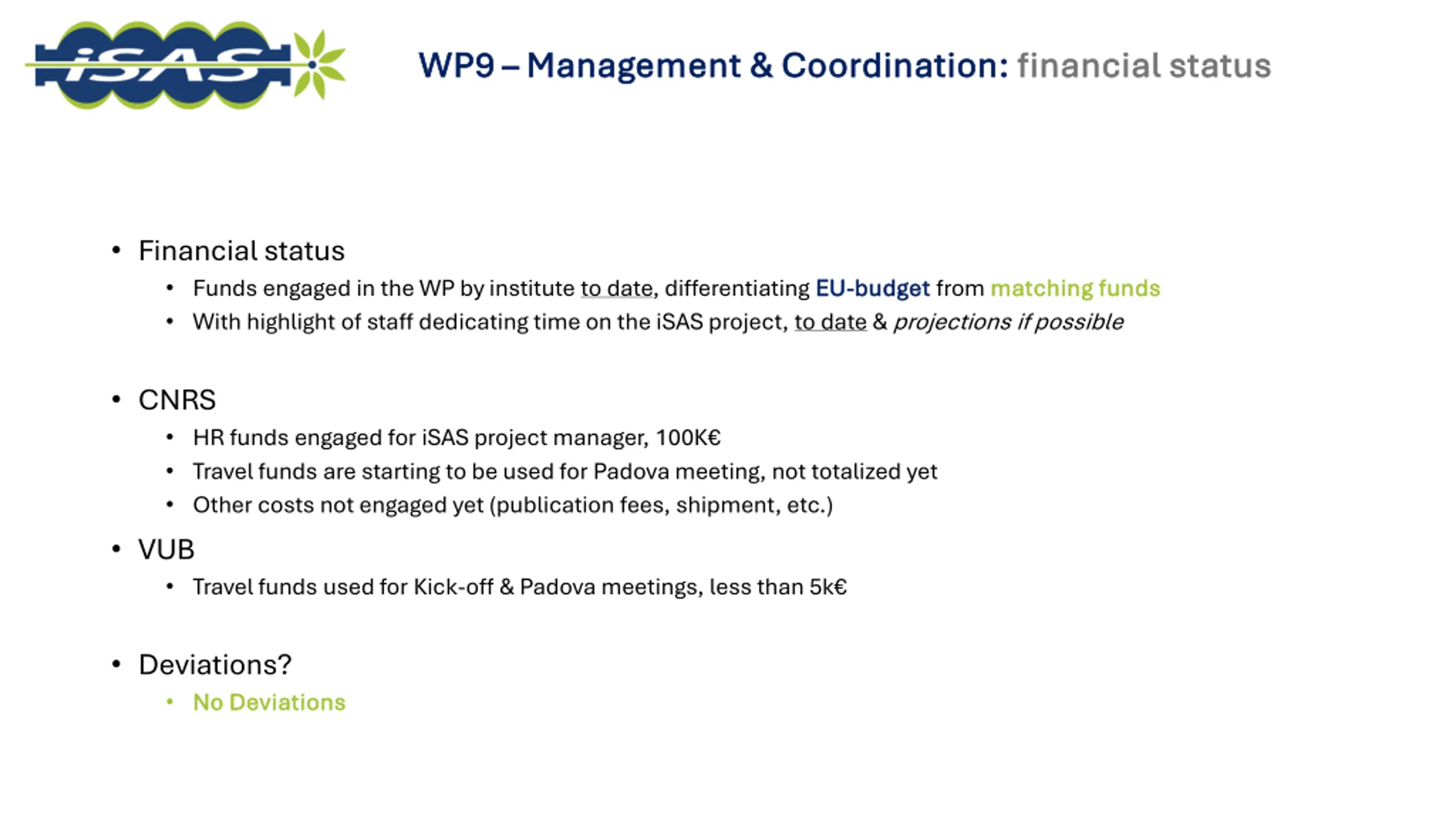 WP9 WP9 Management & Coordination: Management & Coordination: financial status financial status Financial status Funds engaged in the WP by institute to date, differentiating EU With highlight of staff dedicating time on the iSAS project, to date & projections if possible EU- -budget budget from matching funds matching funds CNRS HR funds engaged for iSAS project manager, 100K Travel funds are starting to be used for Padova meeting, not totalized yet Other costs not engaged yet (publication fees, shipment, etc.) VUB Travel funds used for Kick-off & Padova meetings, less than 5k Deviations? No Deviations No Deviations