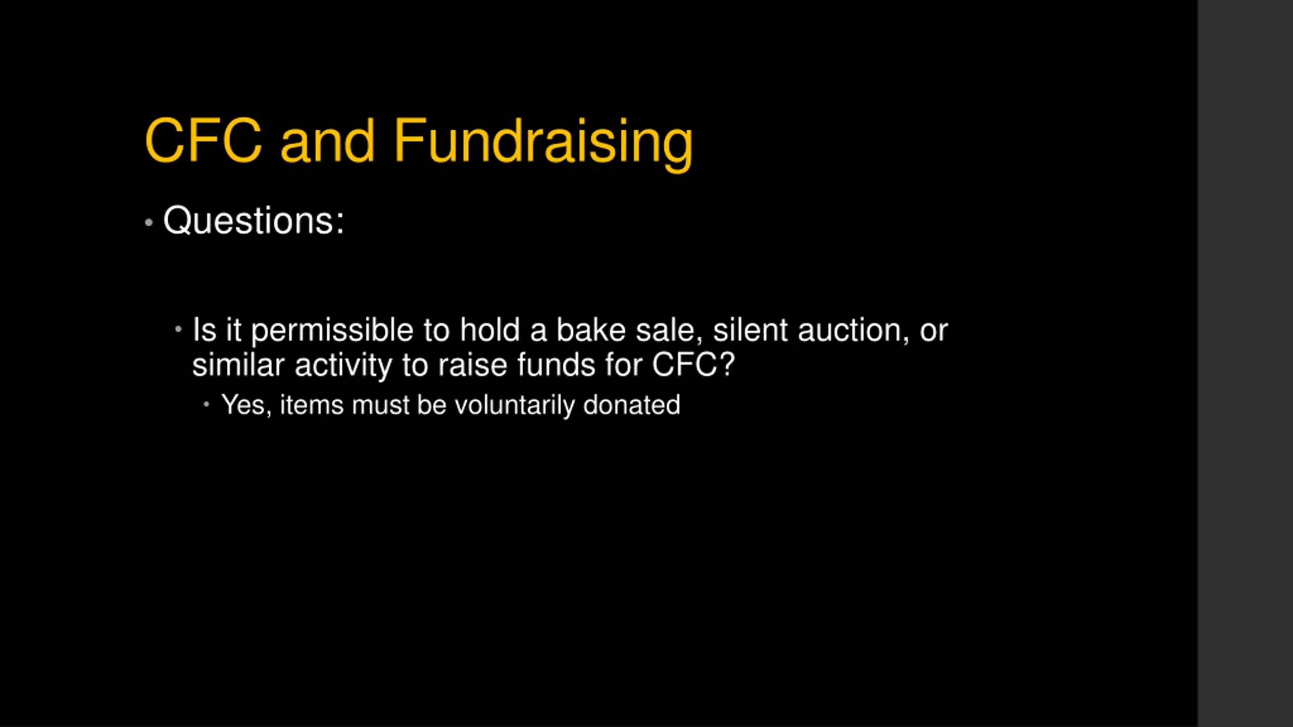 CFC and Fundraising Questions: Is it permissible to hold a bake sale, silent auction, or similar activity to raise funds for CFC? Yes, items must be voluntarily donated