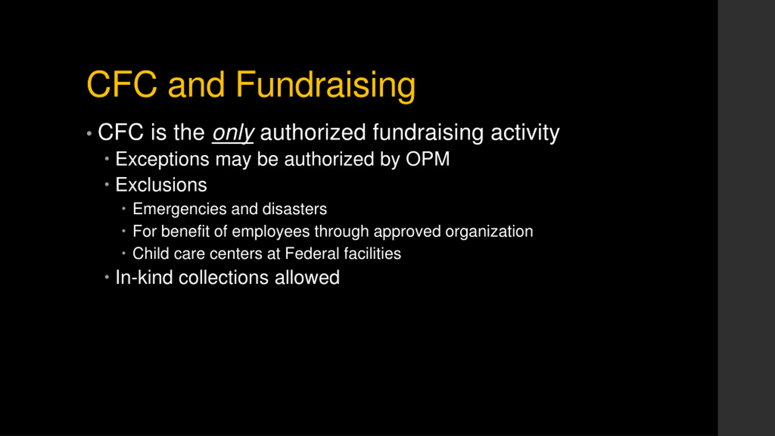 CFC and Fundraising CFC is the only authorized fundraising activity Exceptions may be authorized by OPM Exclusions Emergencies and disasters For benefit of employees through approved organization Child care centers at Federal facilities In-kind collections allowed