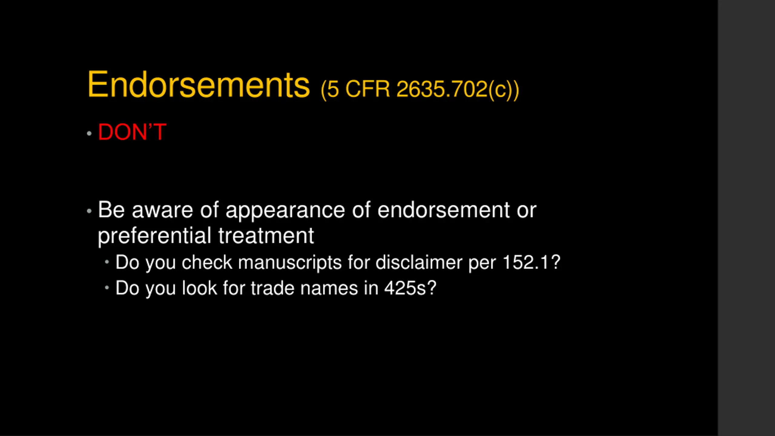 Endorsements (5 CFR 2635.702(c)) DON T Be aware of appearance of endorsement or preferential treatment Do you check manuscripts for disclaimer per 152.1? Do you look for trade names in 425s?