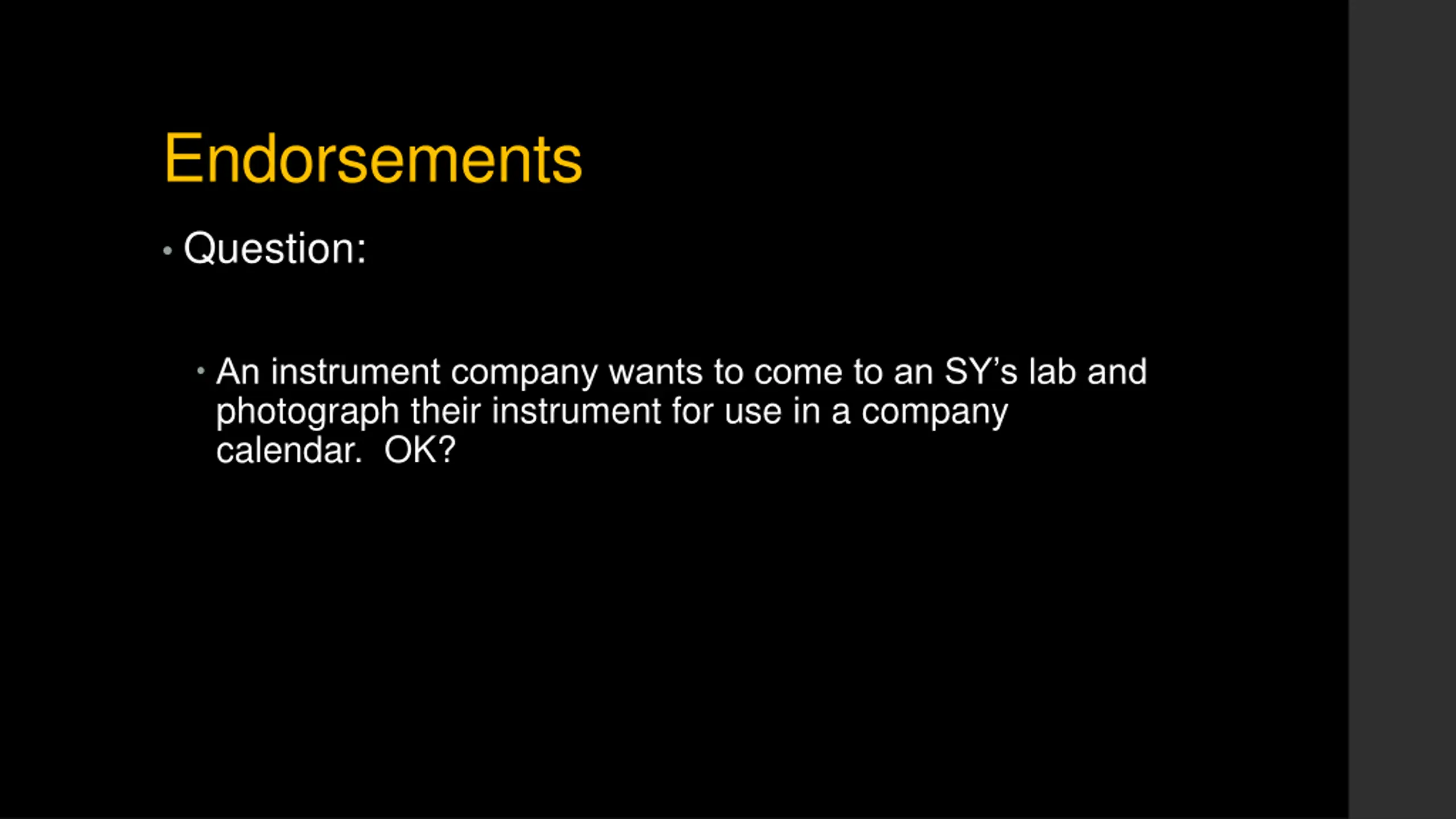 Endorsements Question: An instrument company wants to come to an SY s lab and photograph their instrument for use in a company calendar. OK?