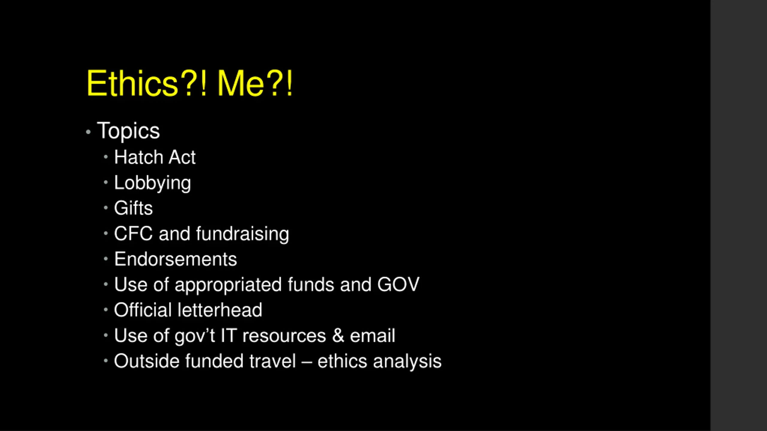 Ethics?! Me?! Topics Hatch Act Lobbying Gifts CFC and fundraising Endorsements Use of appropriated funds and GOV Official letterhead Use of gov t IT resources & email Outside funded travel ethics analysis