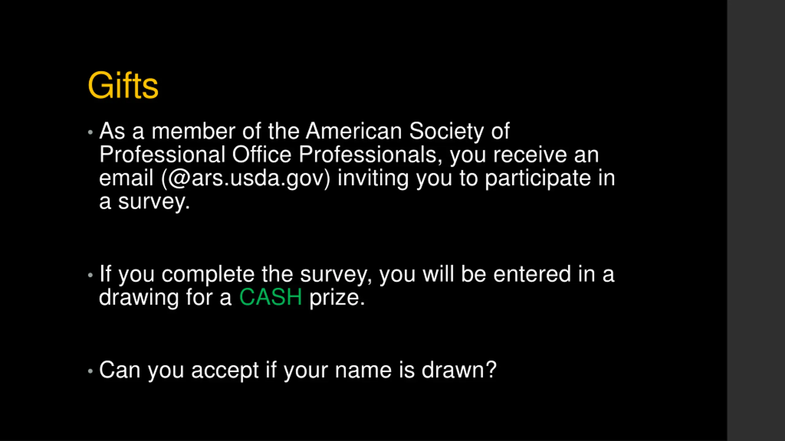 Gifts As a member of the American Society of Professional Office Professionals, you receive an email (@ars.usda.gov) inviting you to participate in a survey. If you complete the survey, you will be entered in a drawing for a CASH prize. Can you accept if your name is drawn?