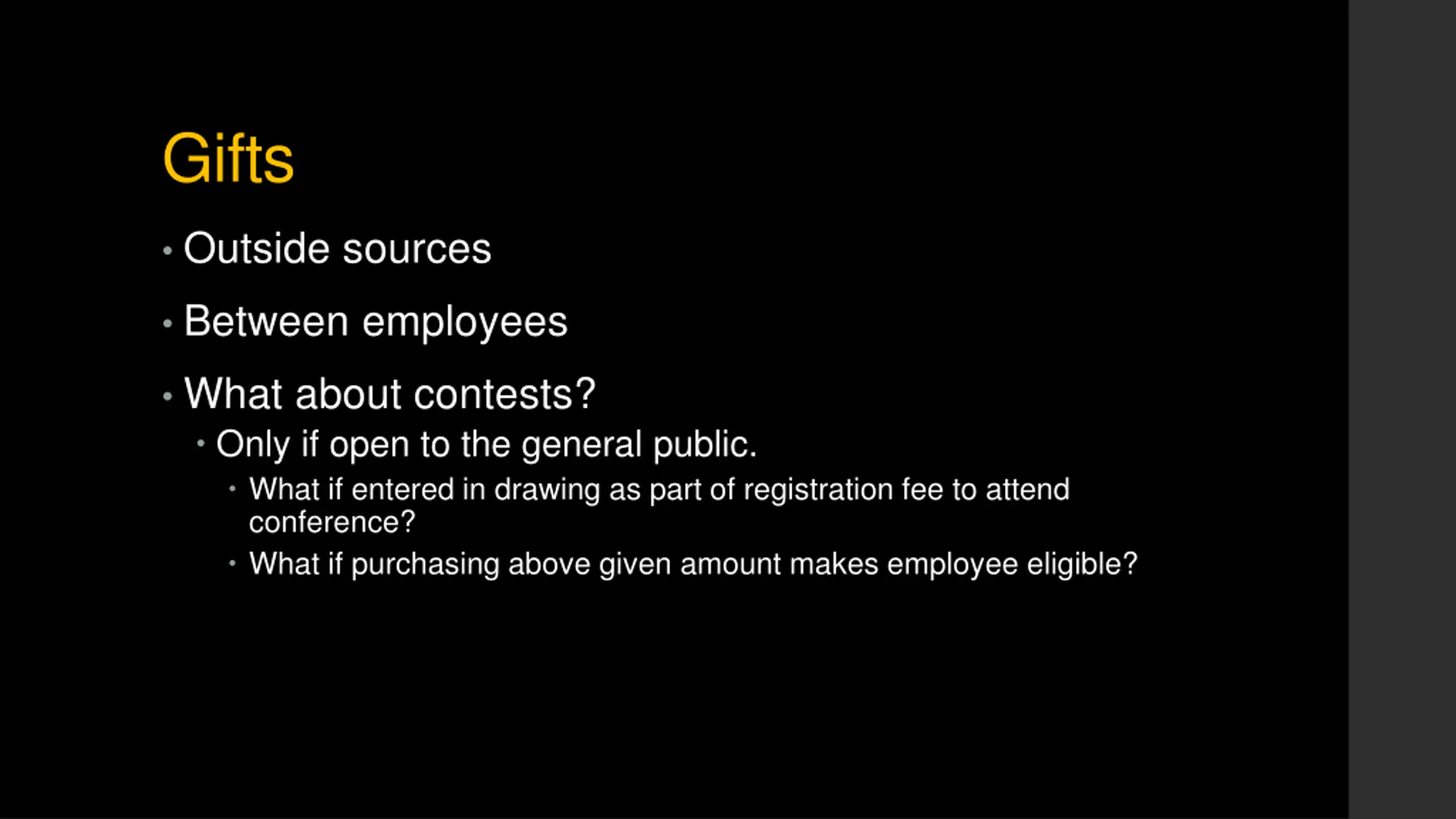 Gifts Outside sources Between employees What about contests? Only if open to the general public. What if entered in drawing as part of registration fee to attend conference? What if purchasing above given amount makes employee eligible?