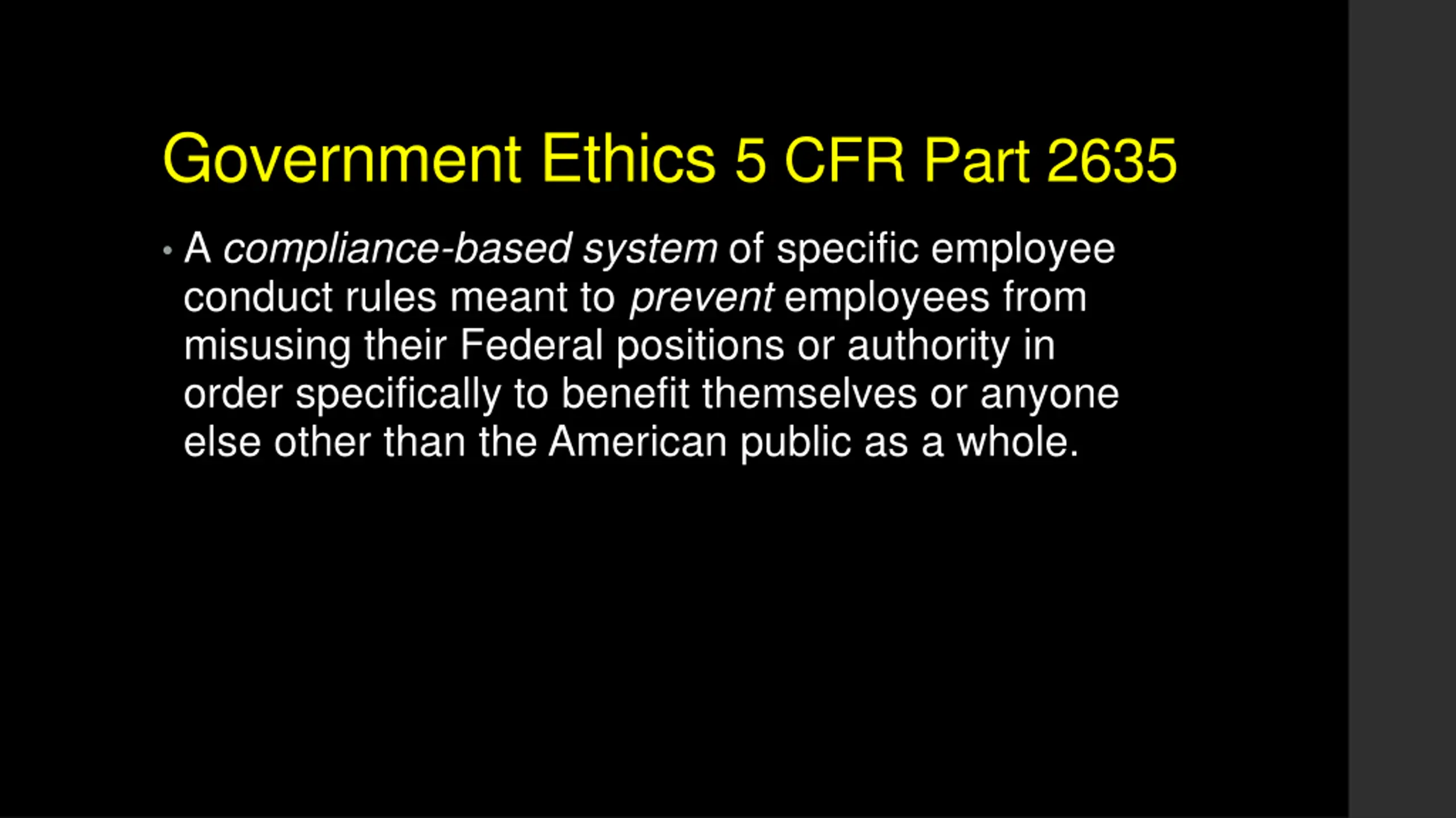 Government Ethics 5 CFR Part 2635 A compliance-based system of specific employee conduct rules meant to prevent employees from misusing their Federal positions or authority in order specifically to benefit themselves or anyone else other than the American public as a whole.