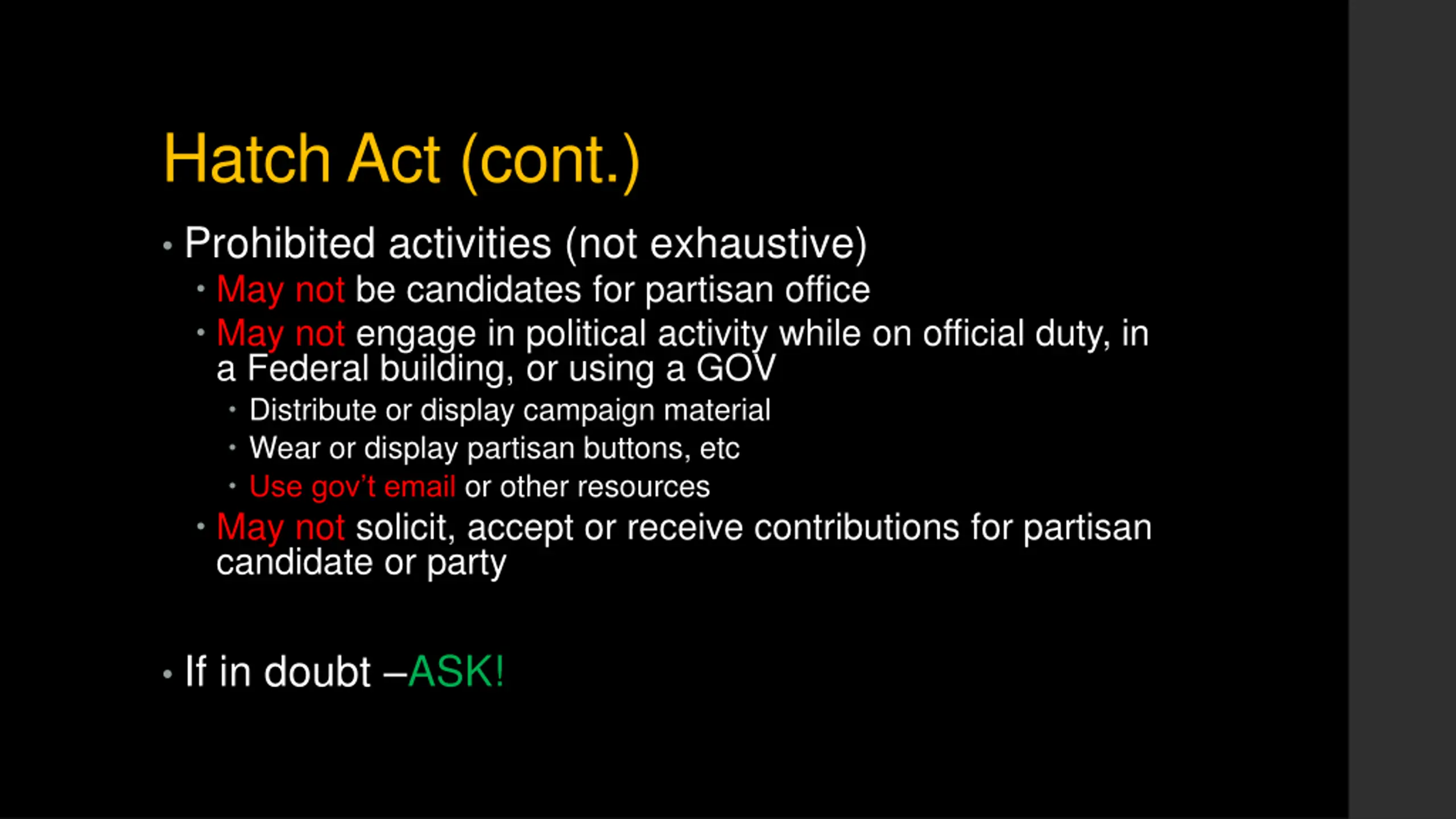 Hatch Act (cont.) Prohibited activities (not exhaustive) May not be candidates for partisan office May not engage in political activity while on official duty, in a Federal building, or using a GOV Distribute or display campaign material Wear or display partisan buttons, etc Use gov t email or other resources May not solicit, accept or receive contributions for partisan candidate or party If in doubt ASK!