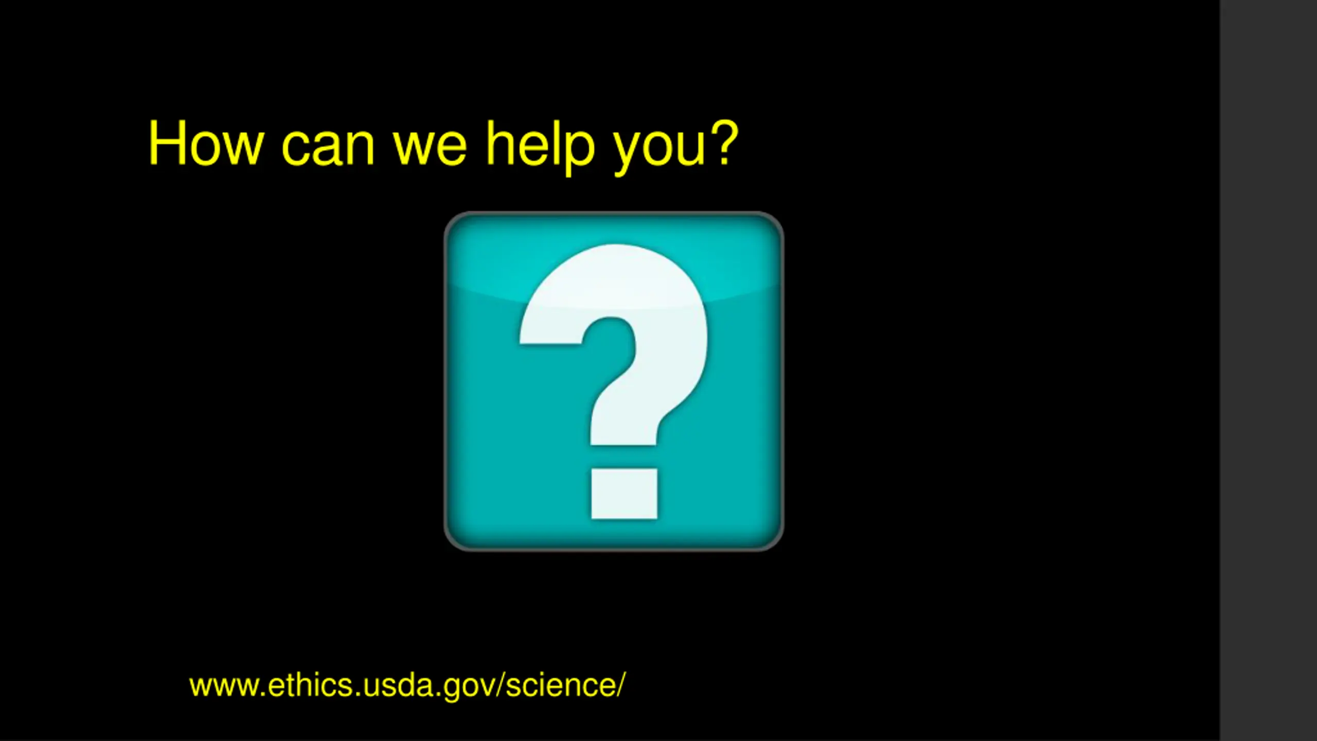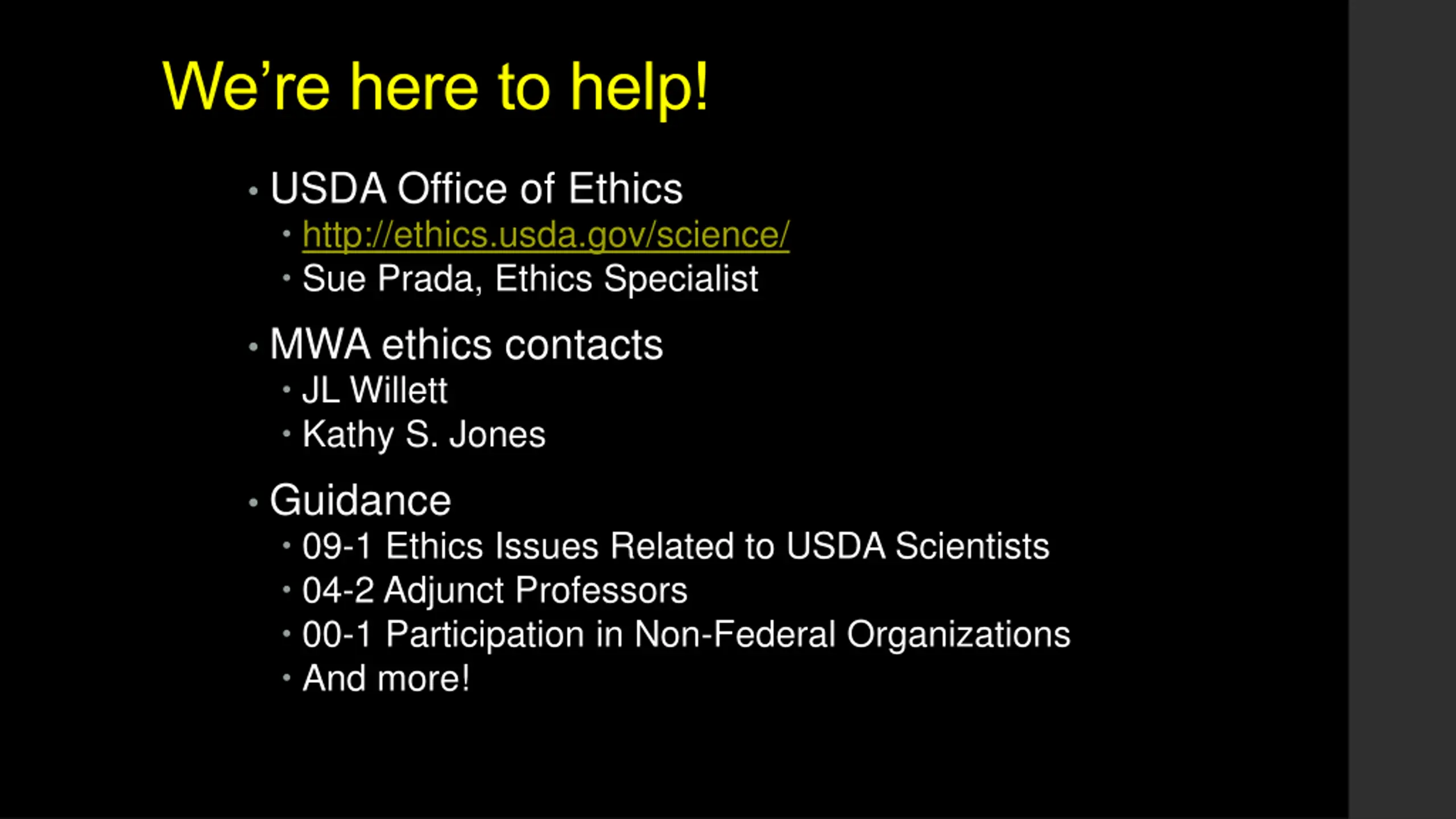 Were here to help! USDA Office of Ethics http://ethics.usda.gov/science/ Sue Prada, Ethics Specialist MWA ethics contacts JL Willett Kathy S. Jones Guidance 09-1 Ethics Issues Related to USDA Scientists 04-2 Adjunct Professors 00-1 Participation in Non-Federal Organizations And more!