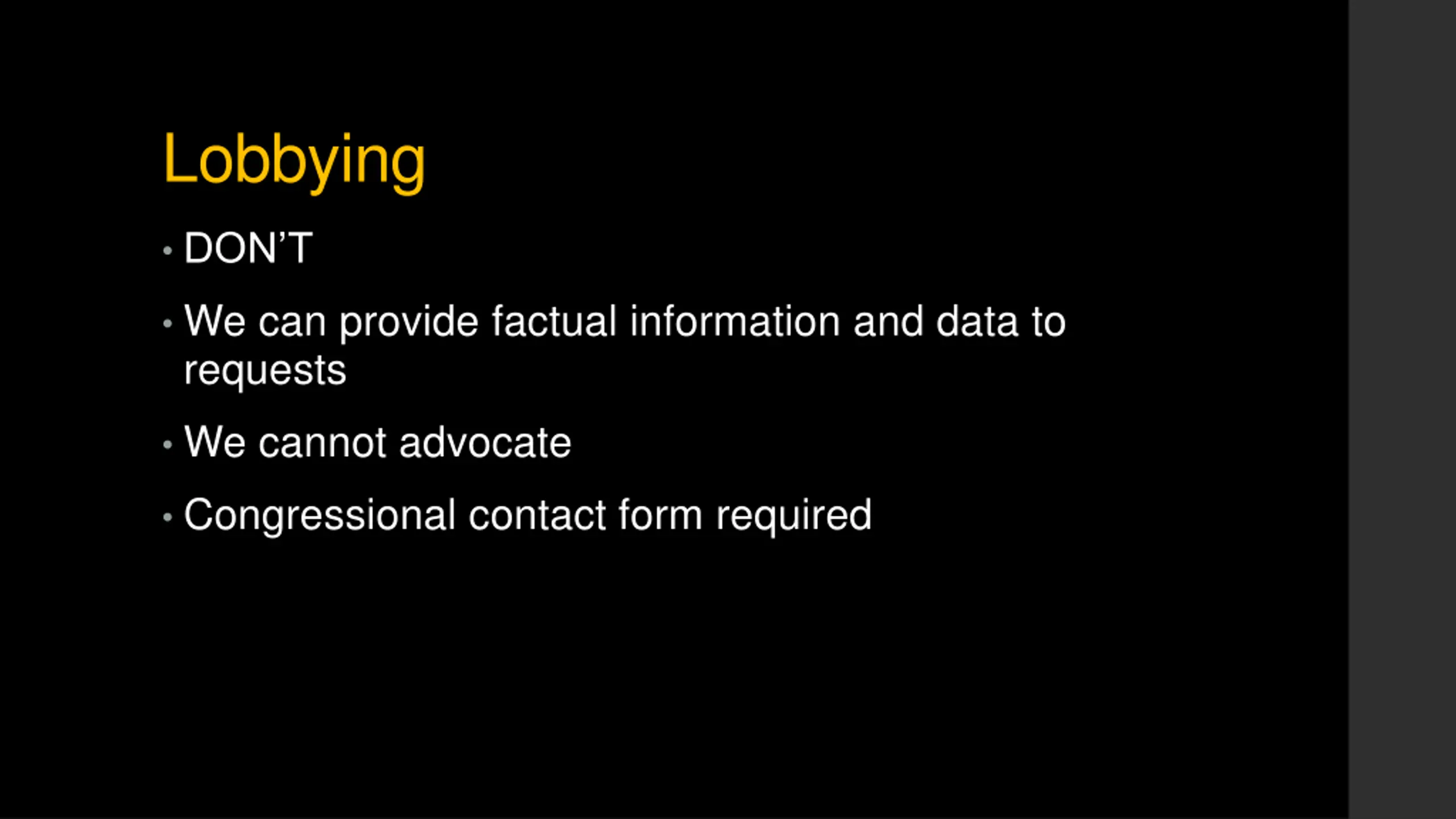 Lobbying DON T We can provide factual information and data to requests We cannot advocate Congressional contact form required
