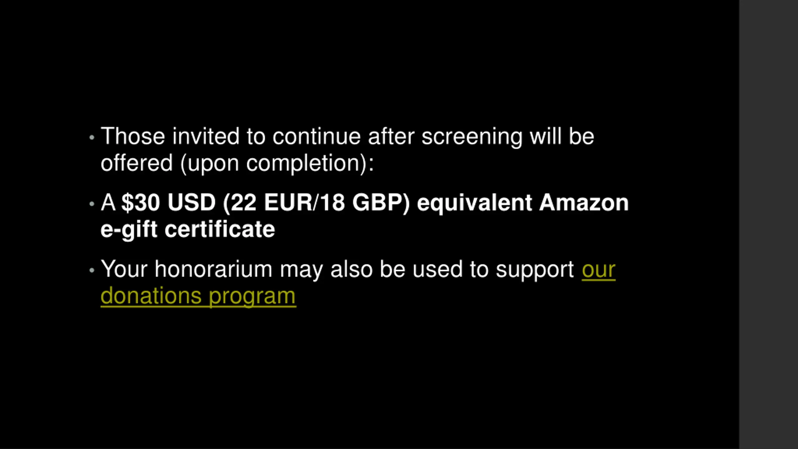 Those invited to continue after screening will be offered (upon completion): A $30 USD (22 EUR/18 GBP) equivalent Amazon e-gift certificate Your honorarium may also be used to support our donations program