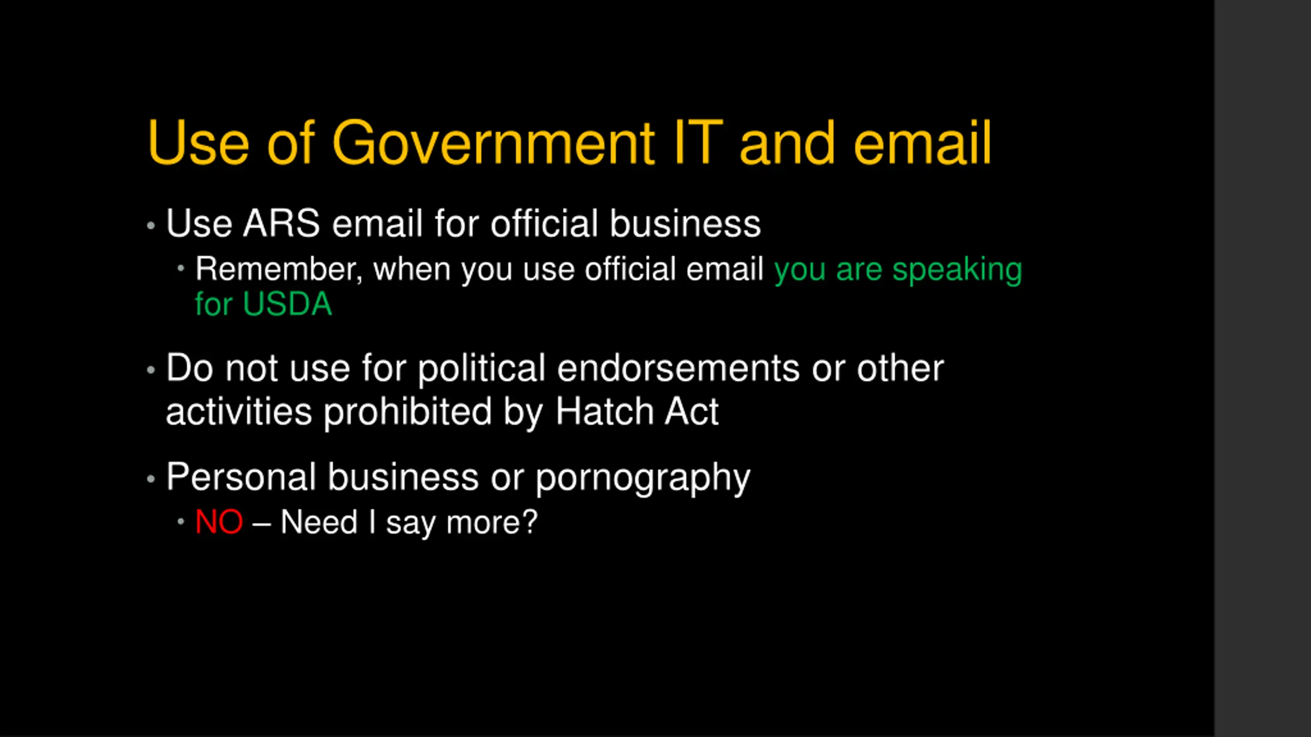 Use of Government IT and email Use ARS email for official business Remember, when you use official email you are speaking for USDA Do not use for political endorsements or other activities prohibited by Hatch Act Personal business or pornography NO Need I say more?