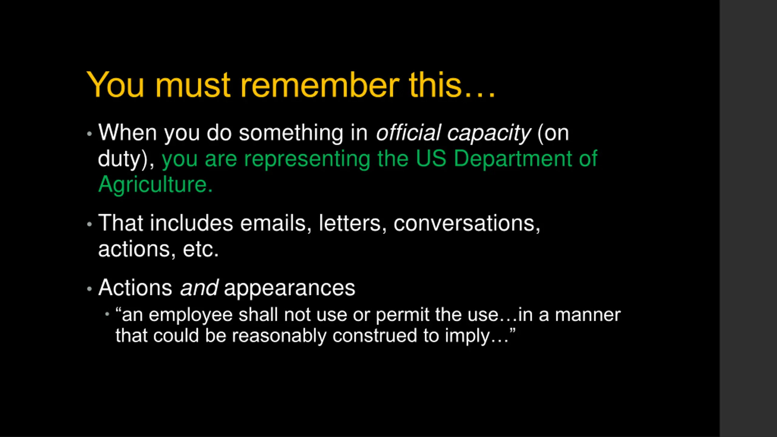 You must remember this When you do something in official capacity (on duty), you are representing the US Department of Agriculture. That includes emails, letters, conversations, actions, etc. Actions and appearances an employee shall not use or permit the use in a manner that could be reasonably construed to imply