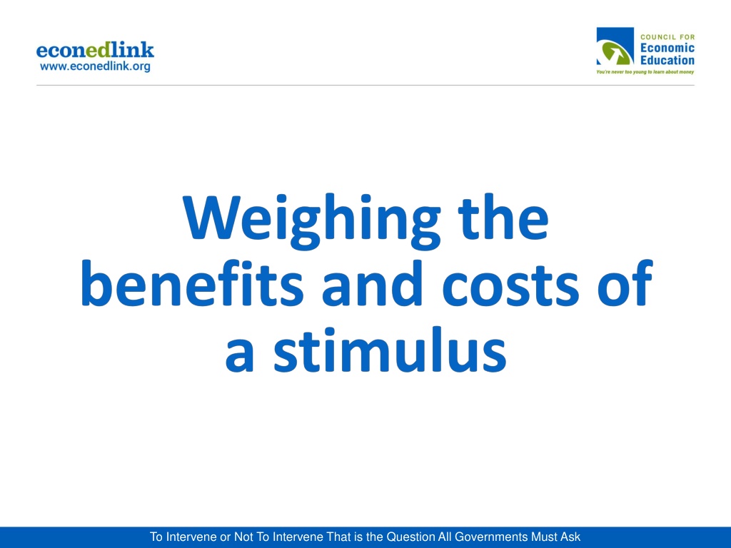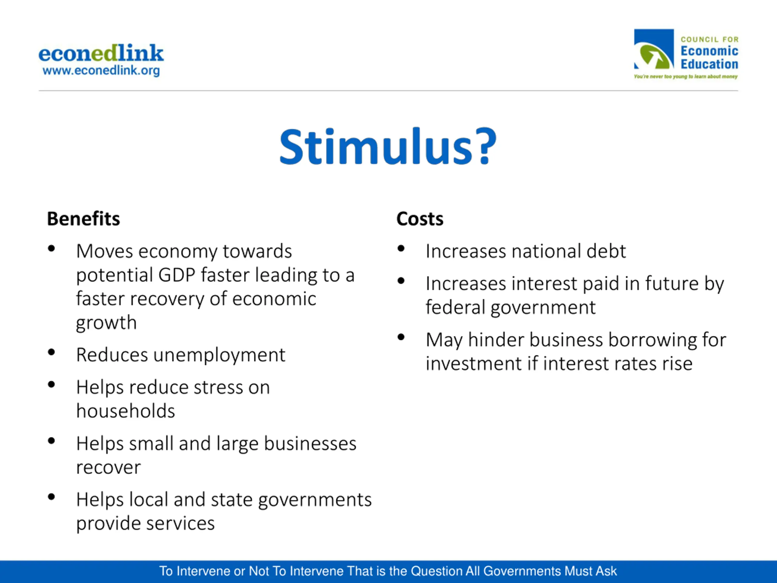 Benefits Moves economy towards potential GDP faster leading to a faster recovery of economic growth Reduces unemployment Helps reduce stress on households Helps small and large businesses recover Helps local and state governments provide services Costs Increases national debt Increases interest paid in future by federal government May hinder business borrowing for investment if interest rates rise To Intervene or Not To Intervene That is the Question All Governments Must Ask