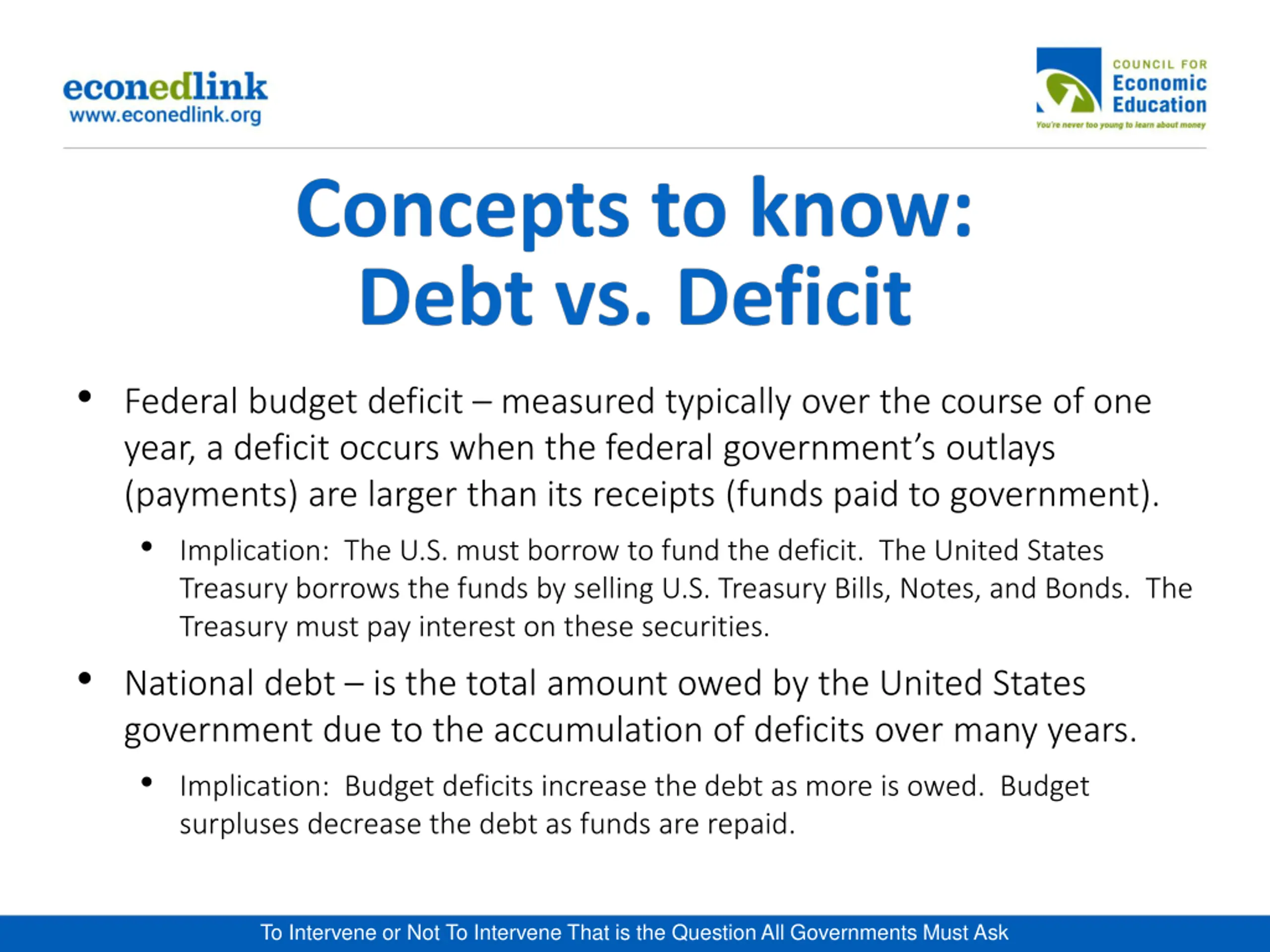 Federal budget deficit measured typically over the course of one year, a deficit occurs when the federal government s outlays (payments) are larger than its receipts (funds paid to government). Implication: The U.S. must borrow to fund the deficit. The United States Treasury borrows the funds by selling U.S. Treasury Bills, Notes, and Bonds. The Treasury must pay interest on these securities. National debt is the total amount owed by the United States government due to the accumulation of deficits over many years. Implication: Budget deficits increase the debt as more is owed. Budget surpluses decrease the debt as funds are repaid. To Intervene or Not To Intervene That is the Question All Governments Must Ask