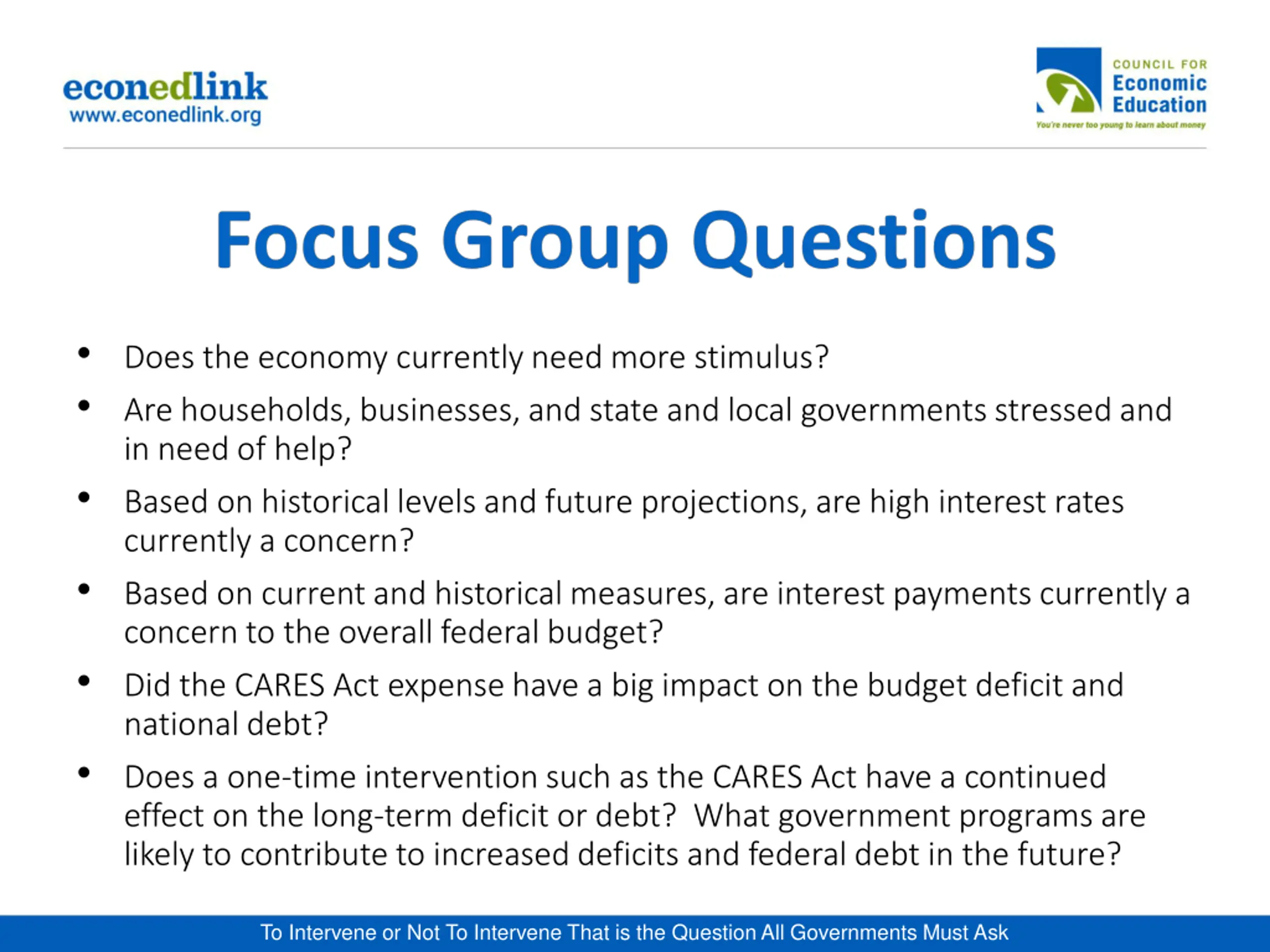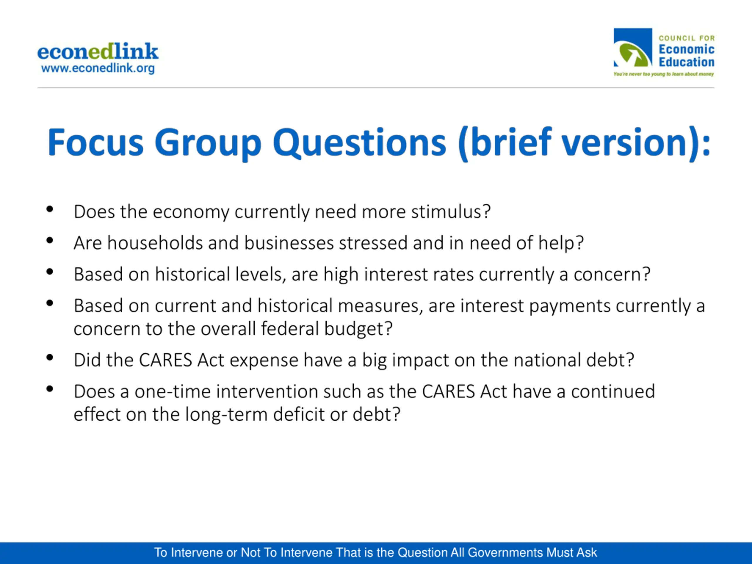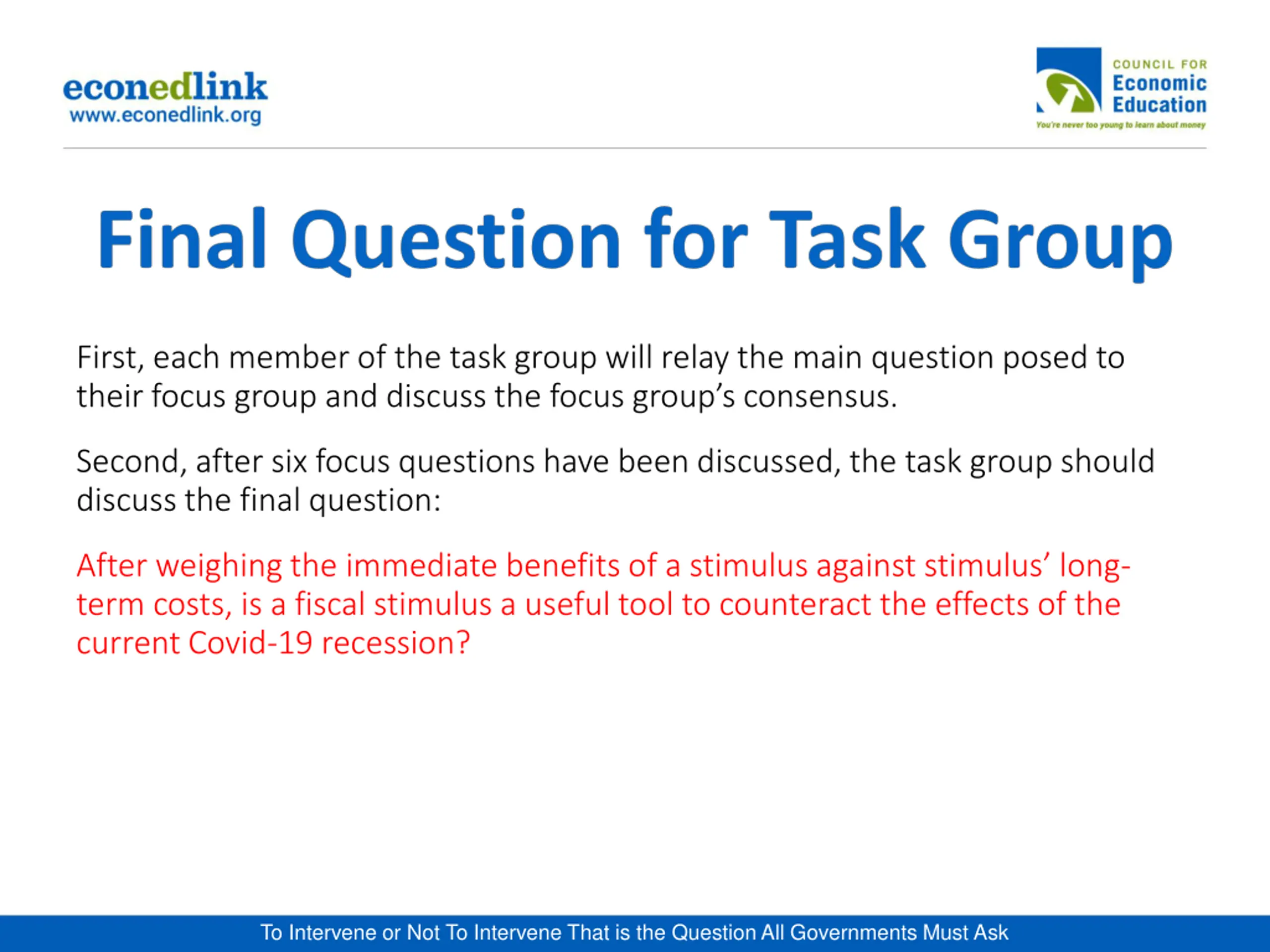 First, each member of the task group will relay the main question posed to their focus group and discuss the focus group s consensus. Second, after six focus questions have been discussed, the task group should discuss the final question: After weighing the immediate benefits of a stimulus against stimulus long- term costs, is a fiscal stimulus a useful tool to counteract the effects of the current Covid-19 recession? To Intervene or Not To Intervene That is the Question All Governments Must Ask