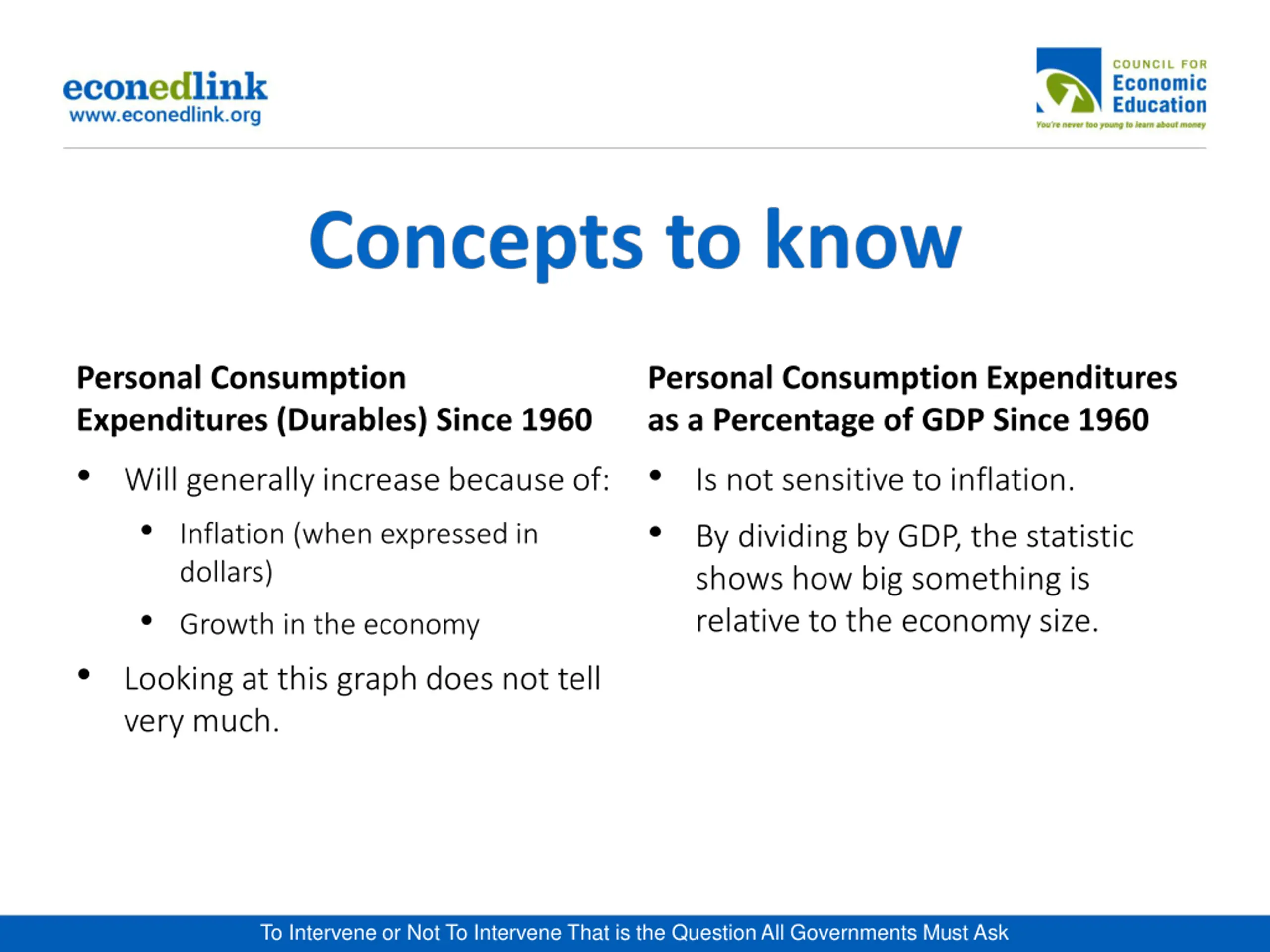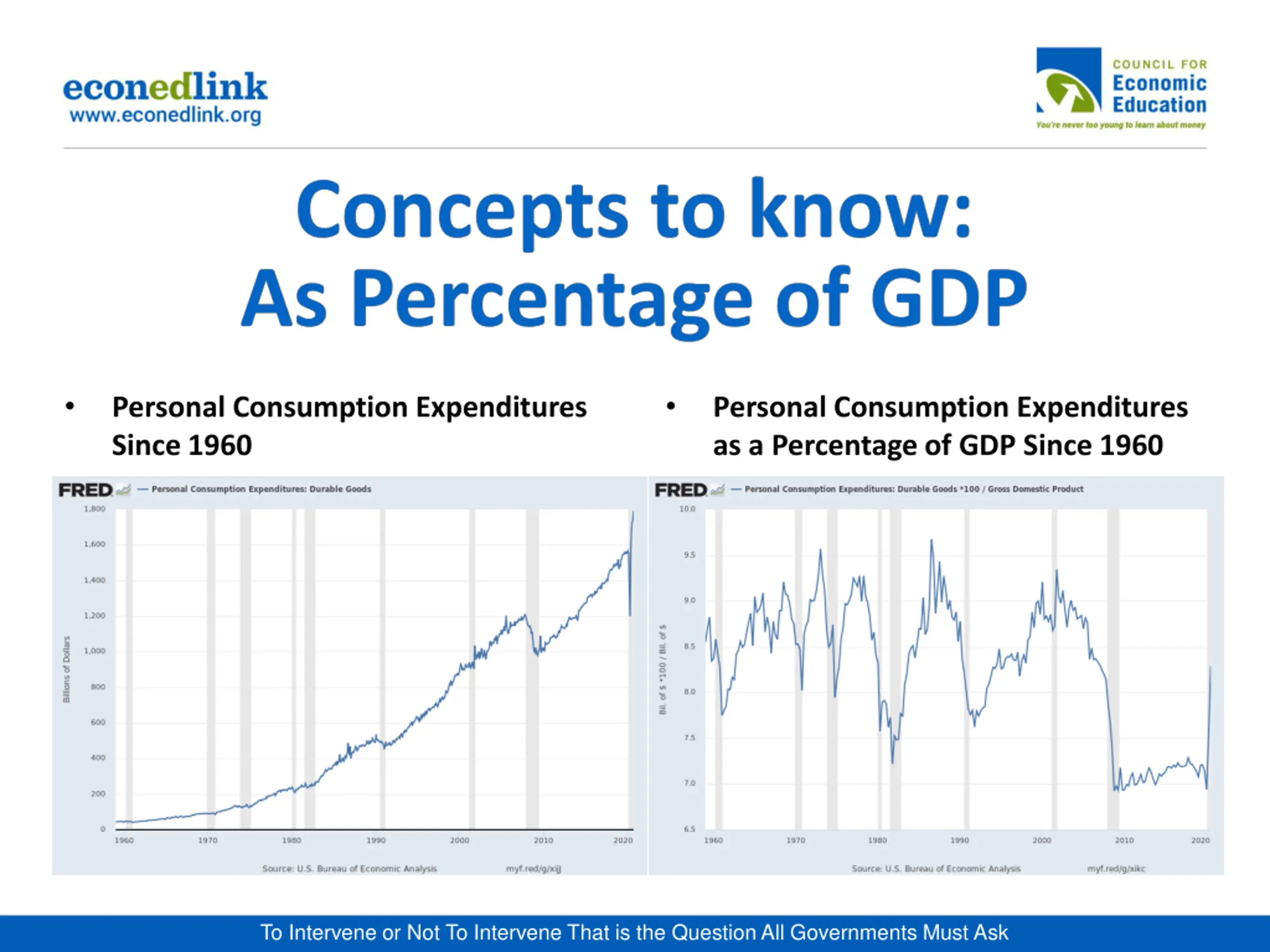 Personal Consumption Expenditures (Durables) Since 1960 Will generally increase because of: Inflation (when expressed in dollars) Growth in the economy Looking at this graph does not tell very much. Personal Consumption Expenditures as a Percentage of GDP Since 1960 Is not sensitive to inflation. By dividing by GDP, the statistic shows how big something is relative to the economy size. To Intervene or Not To Intervene That is the Question All Governments Must Ask