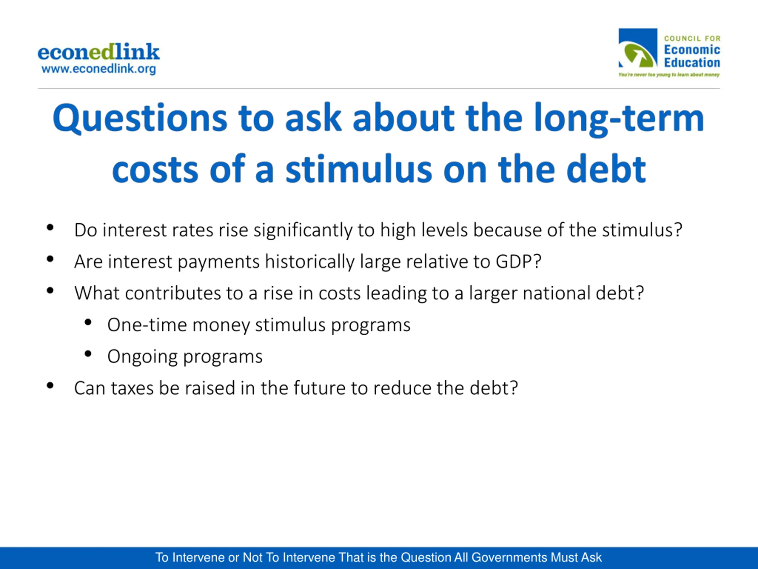 Do interest rates rise significantly to high levels because of the stimulus? Are interest payments historically large relative to GDP? What contributes to a rise in costs leading to a larger national debt? One-time money stimulus programs Ongoing programs Can taxes be raised in the future to reduce the debt? To Intervene or Not To Intervene That is the Question All Governments Must Ask