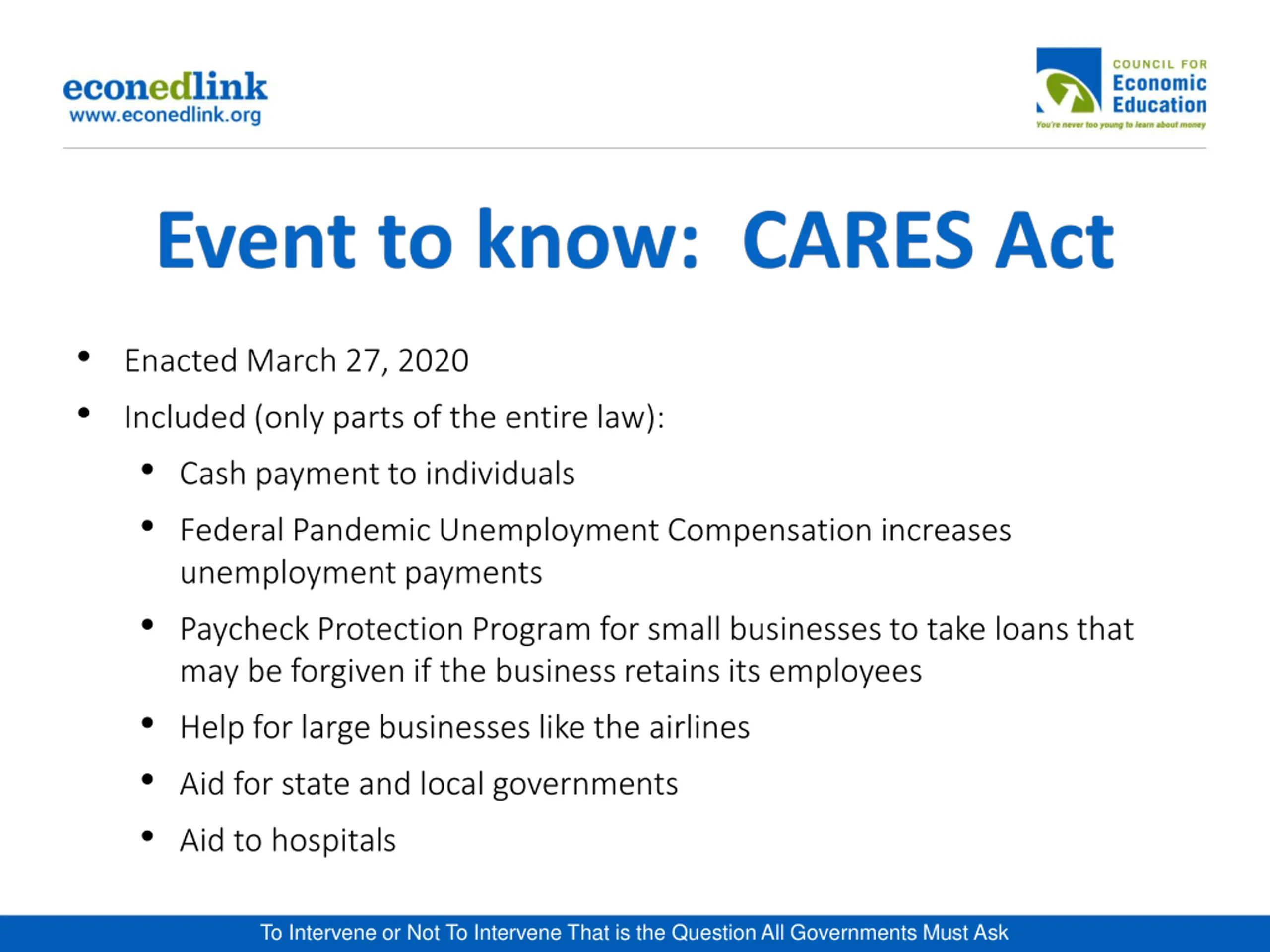Enacted March 27, 2020 Included (only parts of the entire law): Cash payment to individuals Federal Pandemic Unemployment Compensation increases unemployment payments Paycheck Protection Program for small businesses to take loans that may be forgiven if the business retains its employees Help for large businesses like the airlines Aid for state and local governments Aid to hospitals To Intervene or Not To Intervene That is the Question All Governments Must Ask